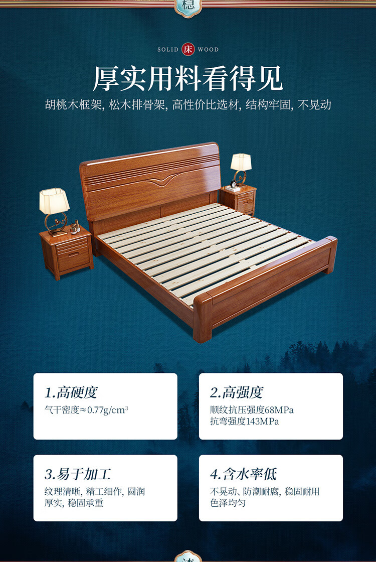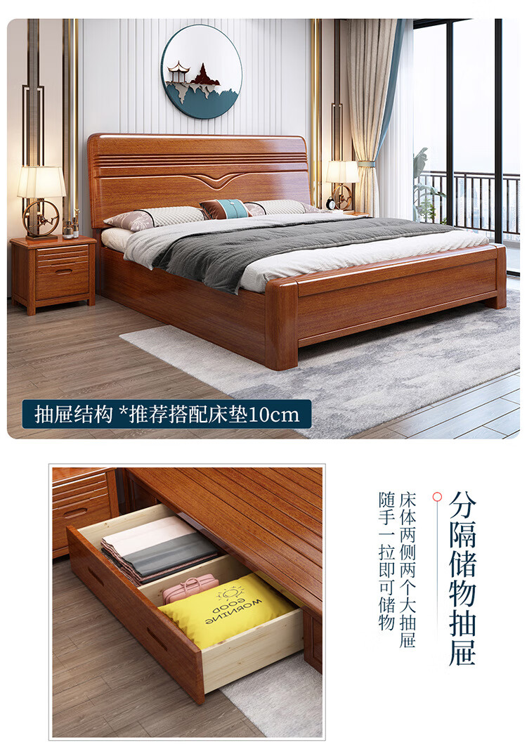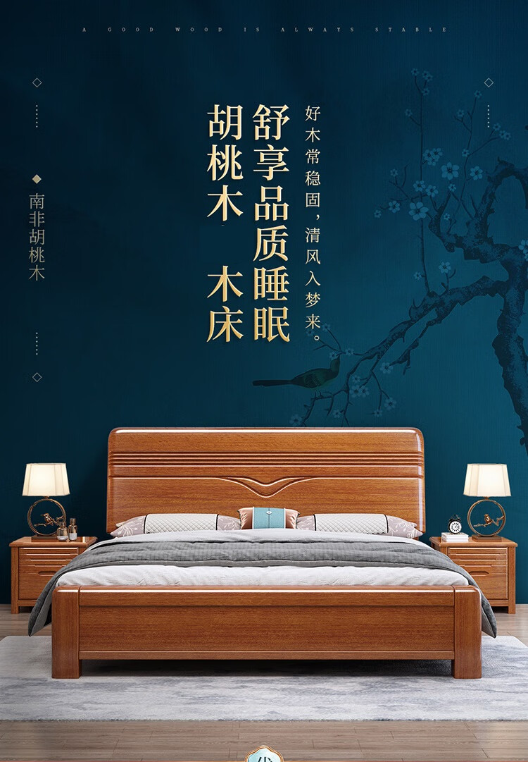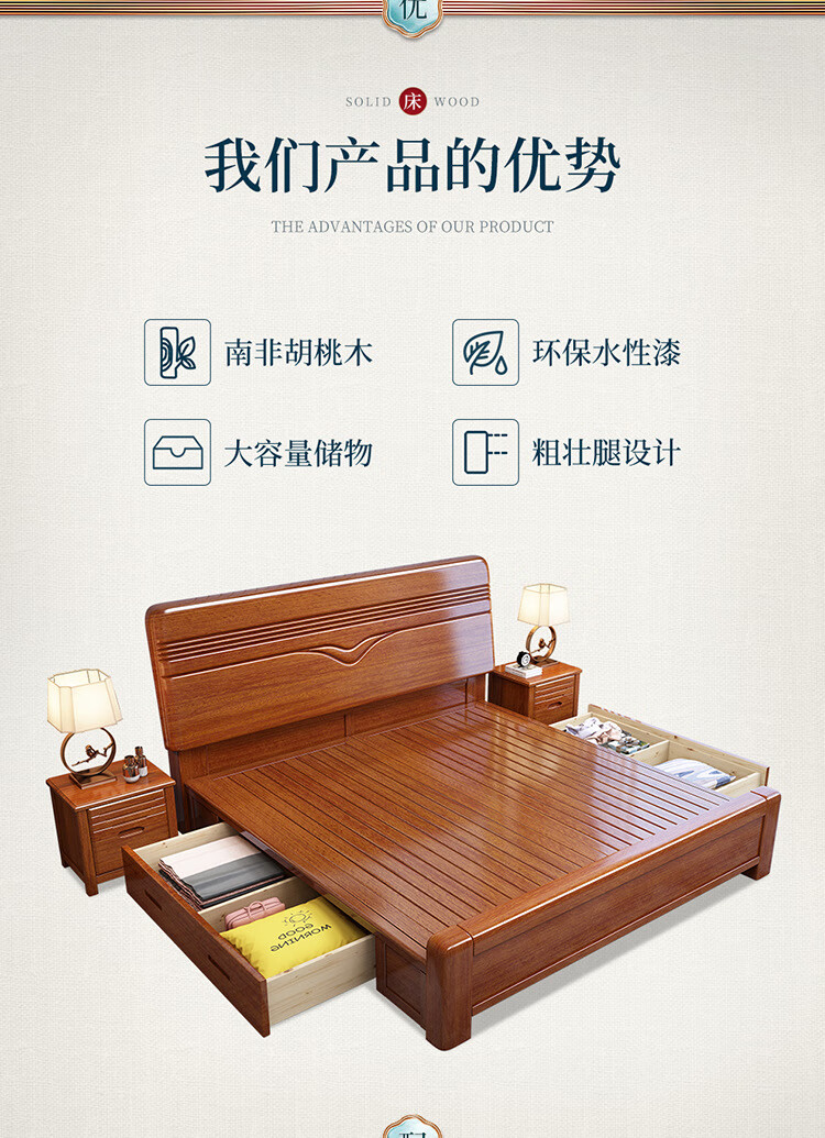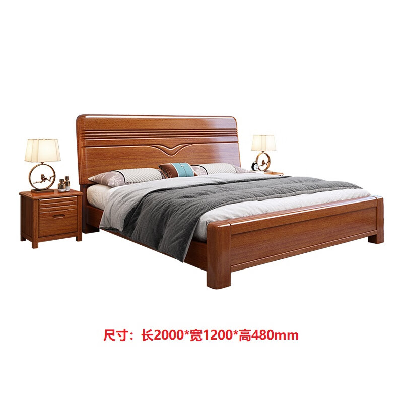 洛来宝现代中式全木床单双人床家用胡桃木带储物公寓床含椰棕床垫1.2米单位:张 棕色