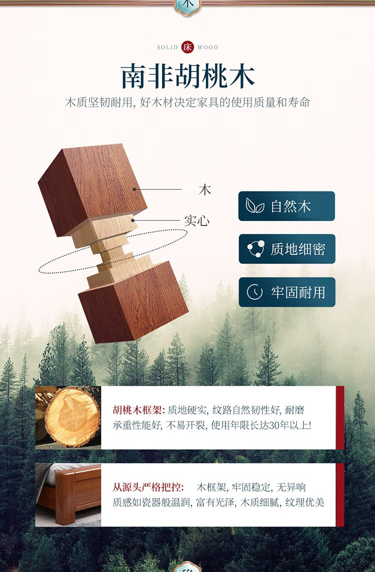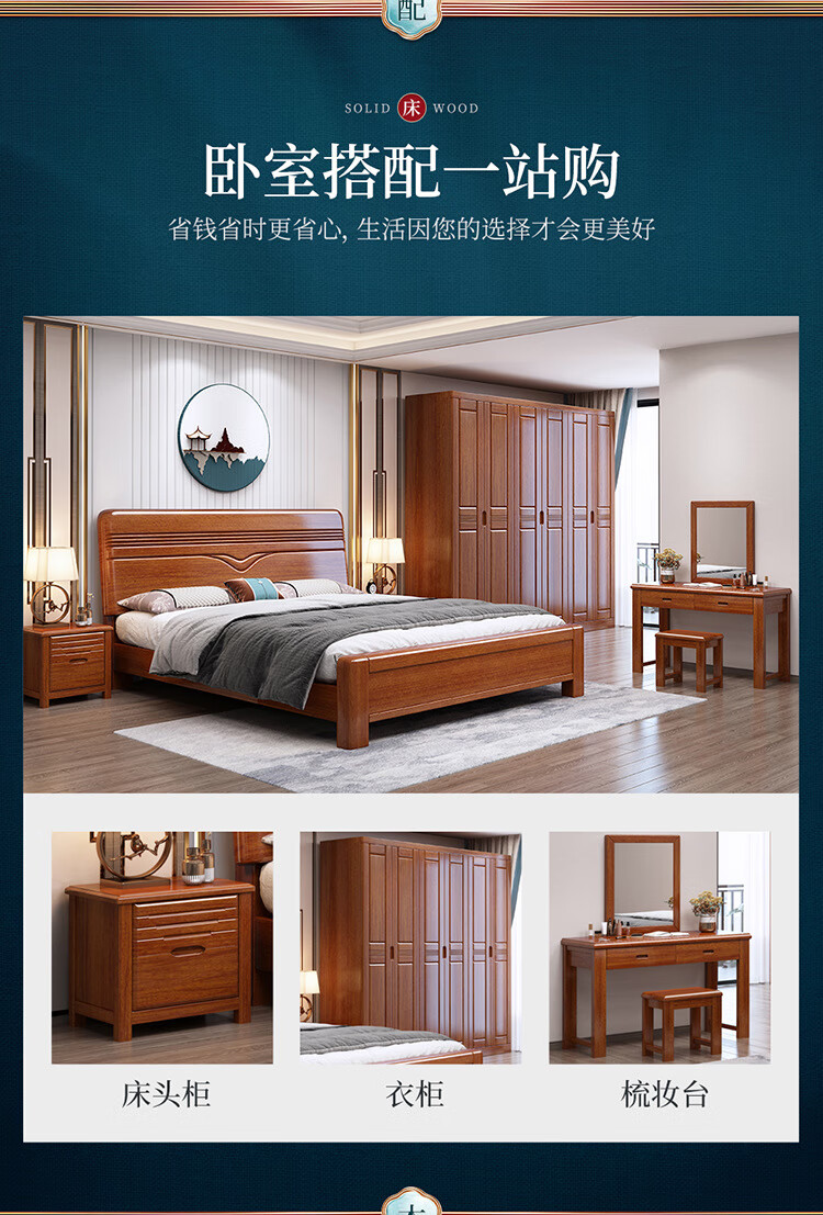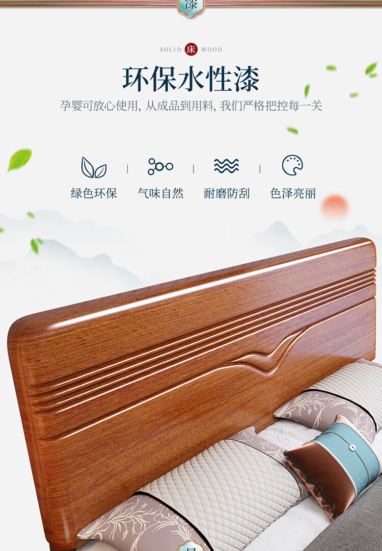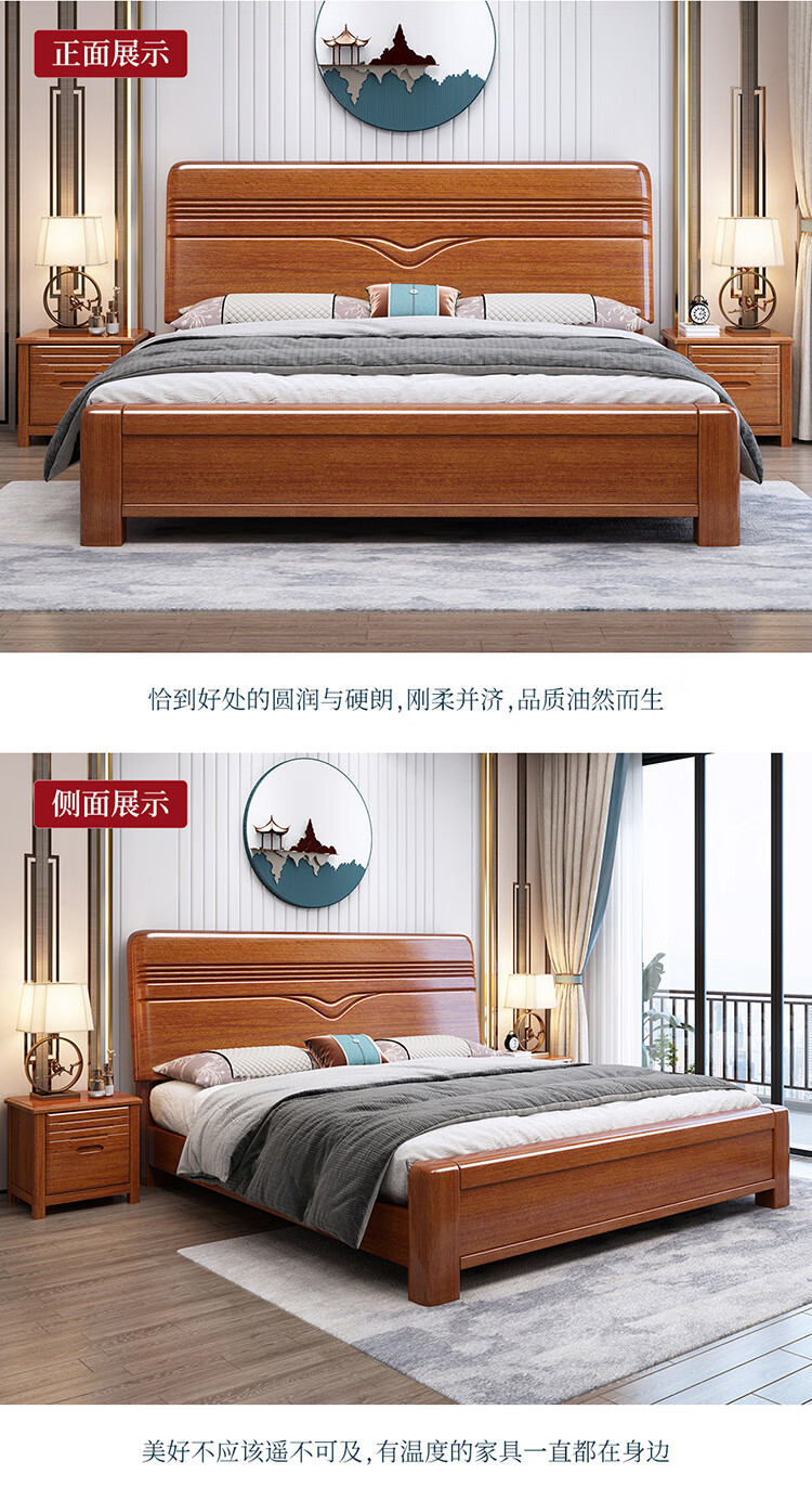 洛来宝现代中式全木床单双人床家用胡桃木带储物公寓床含椰棕床垫1.2米单位:张 棕色