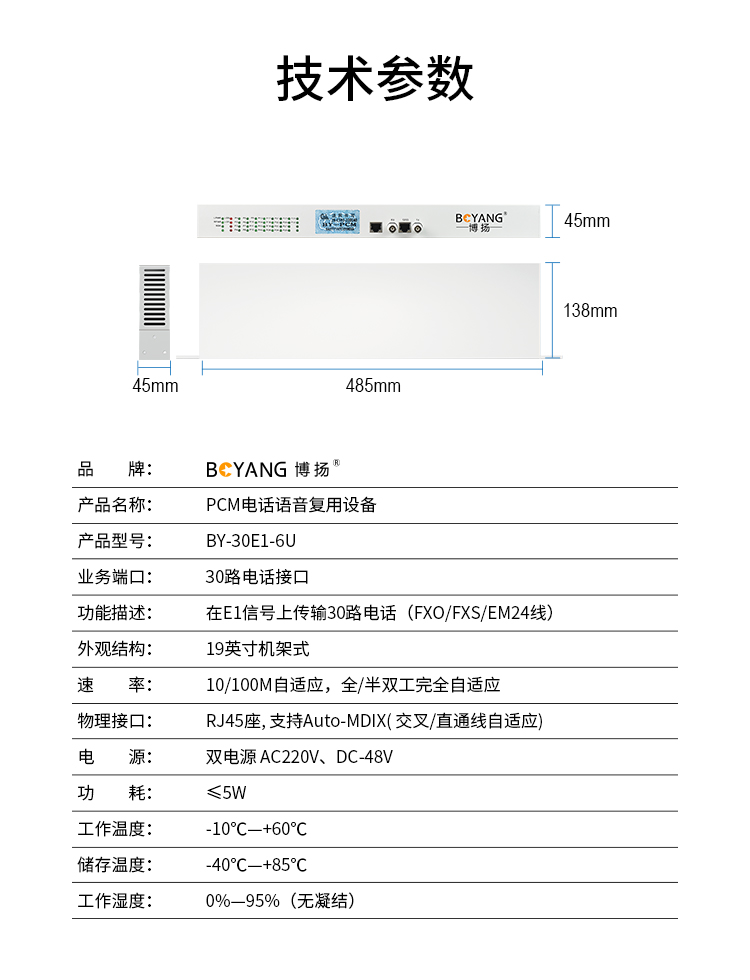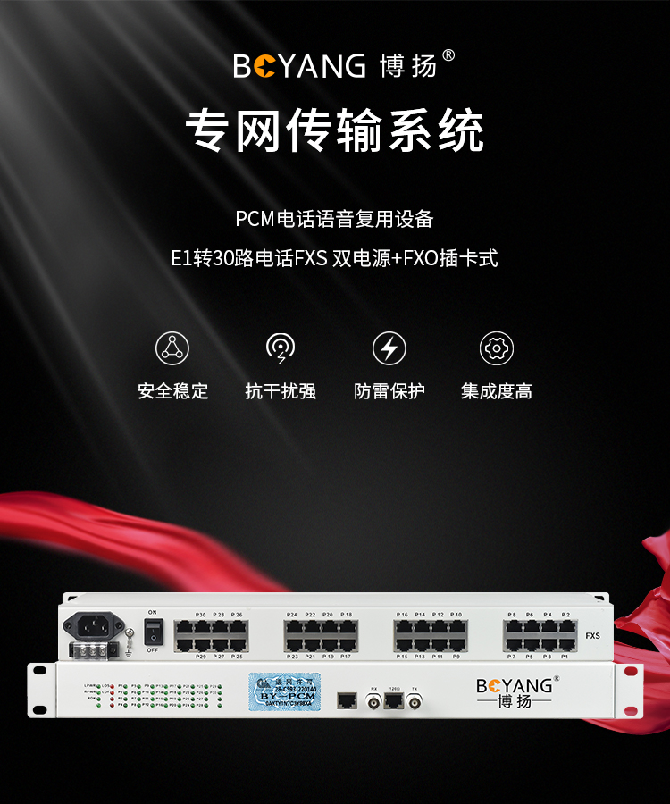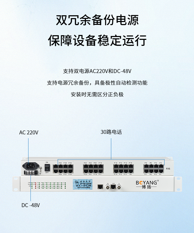 博扬 BY-30E1-6U PCM电话语音复用设备 E1转30路电话FXS 机架式双电源+FXO插卡 白色