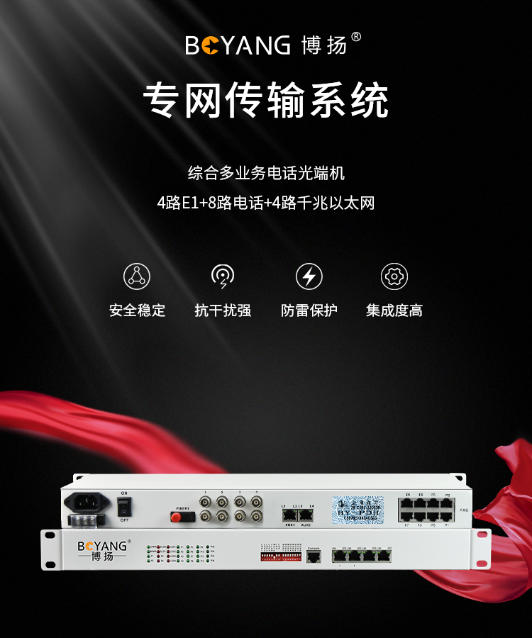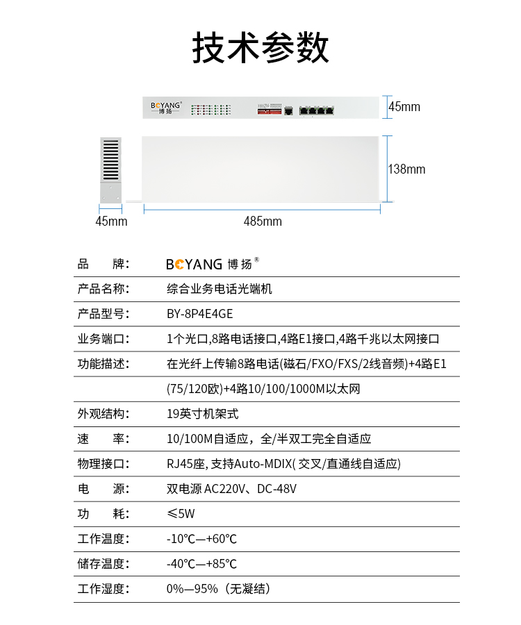博扬 综合业务电话光端机 4路E1+8路电话+4路千兆以太网 单纤60km 机架式单电源 1对价 白色