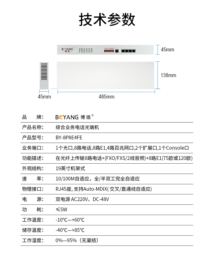 博扬 综合业务电话光端机 8路E1+8路电话+4路百兆以太网 单纤60km 机架式单电源 1对价 白色
