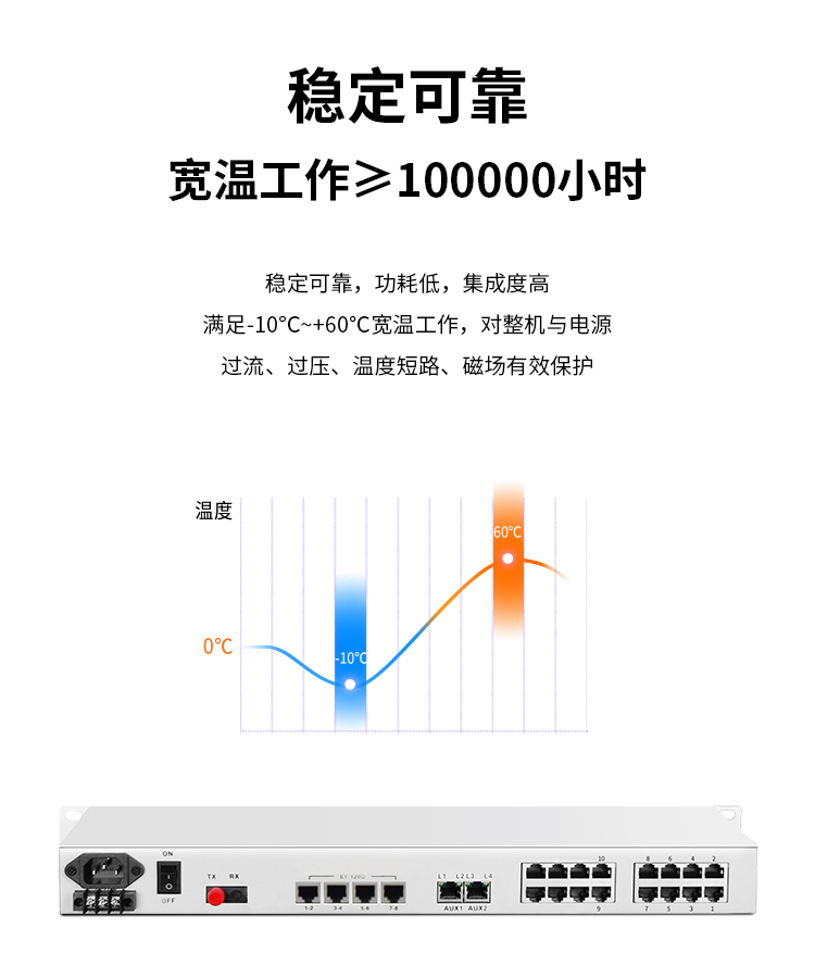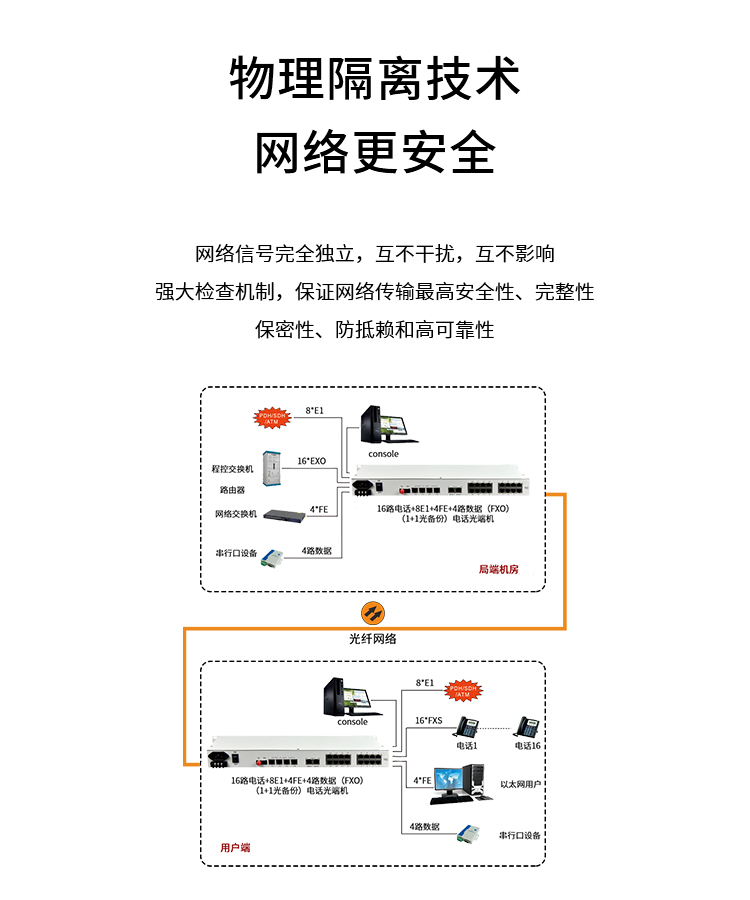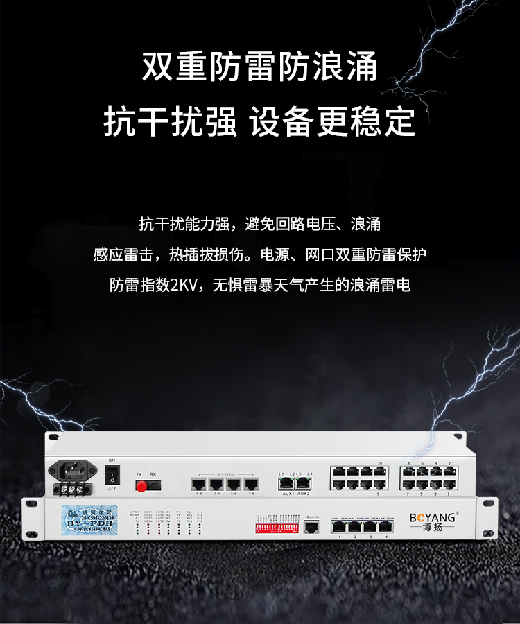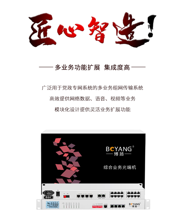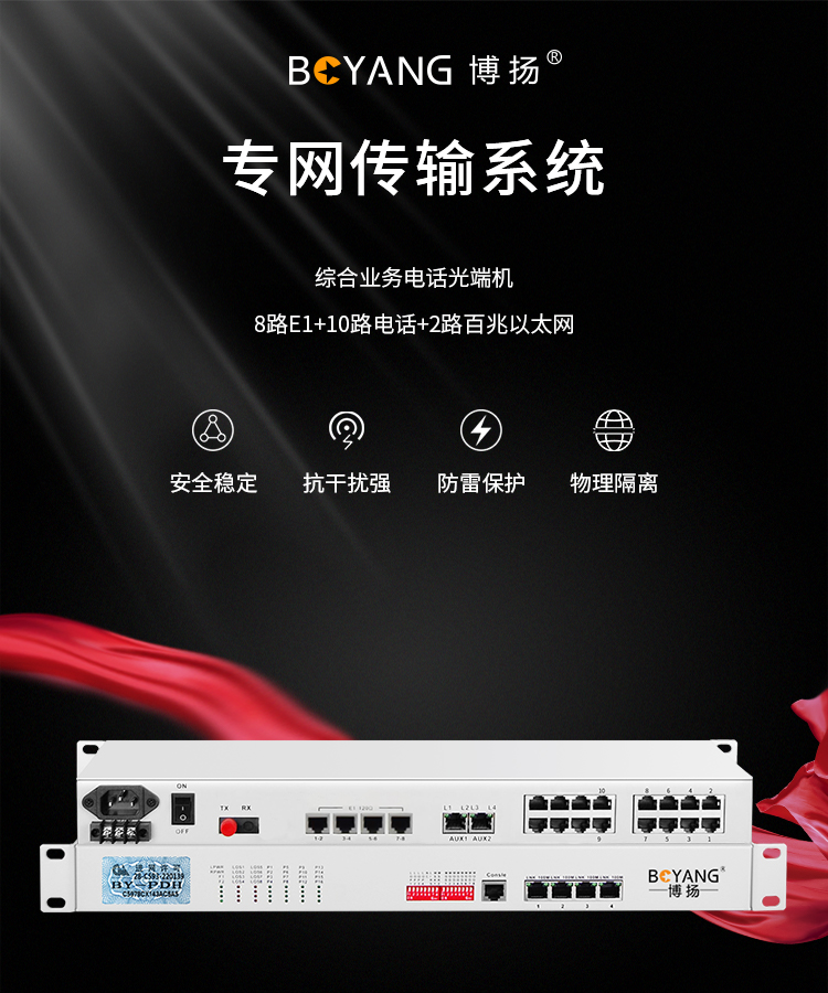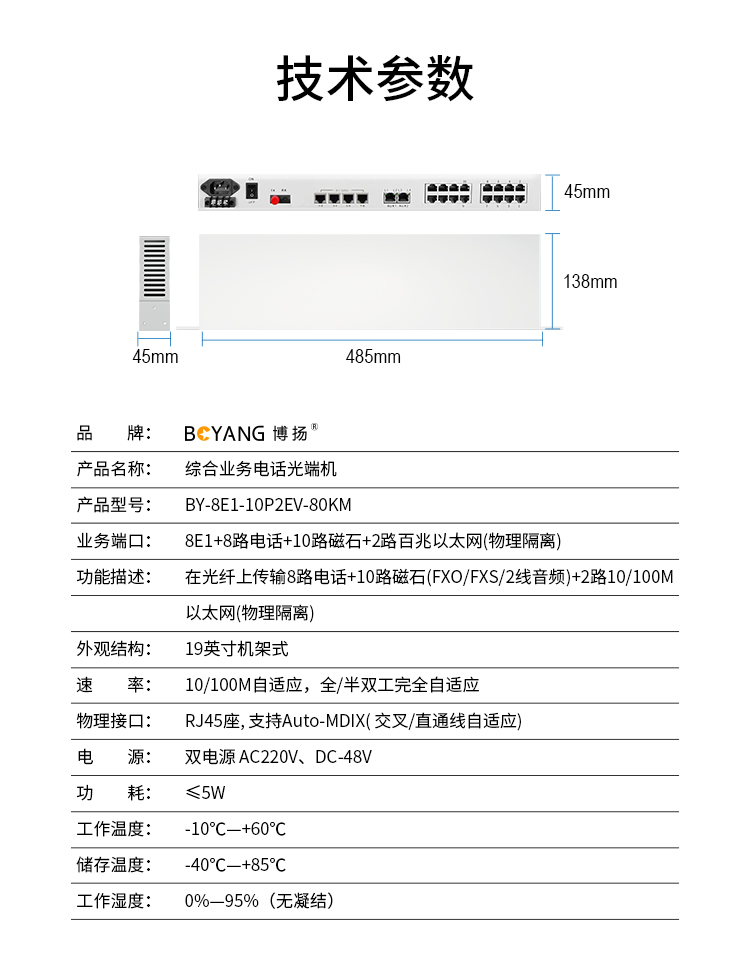 博扬 综合业务电话光端机 8路E1+10路电话+2路百兆以太网物理隔离 单纤80km 机架式1对价 白色