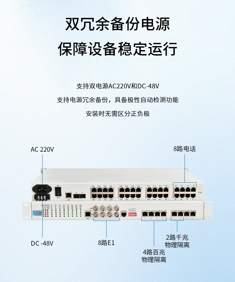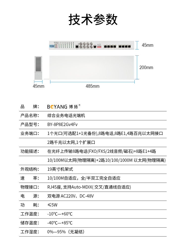 博扬 综合业务电话光端机 8E1+8电话+2路千兆+4路百兆以太网物理隔离 LC单纤60km机架式 白色