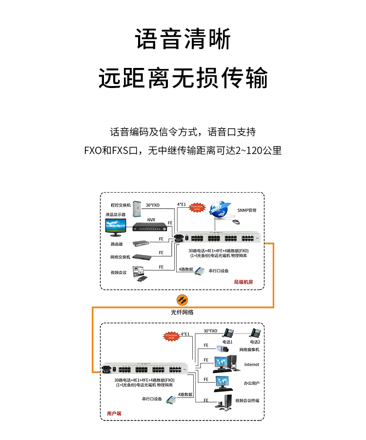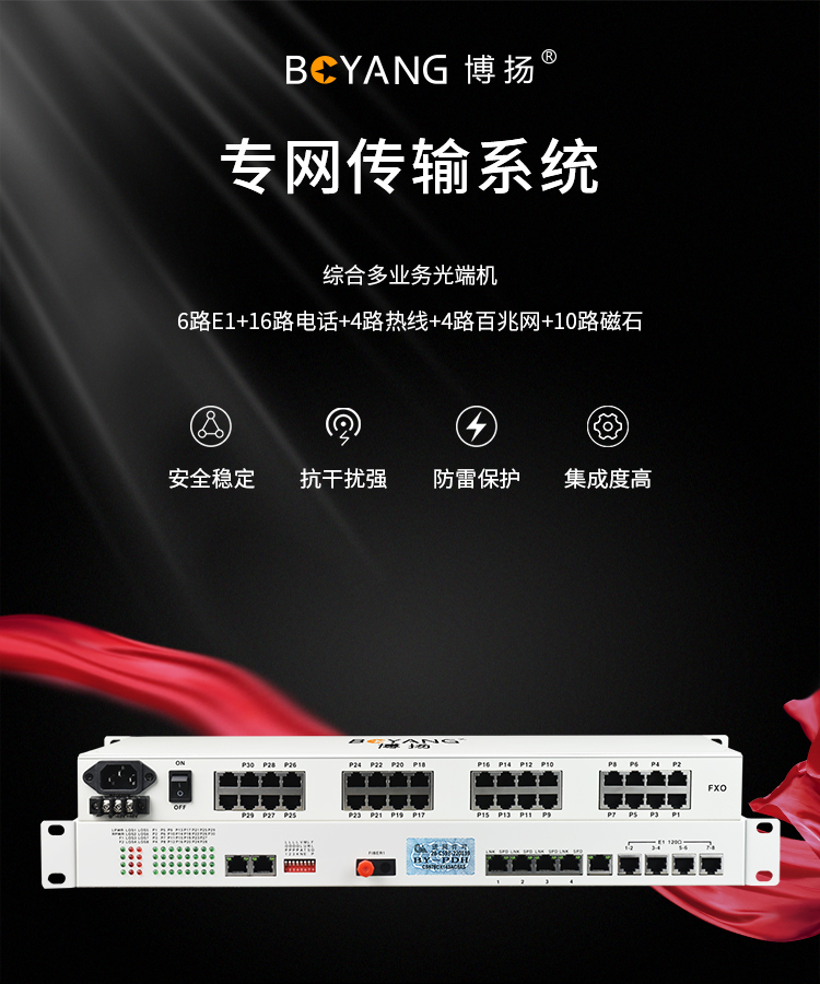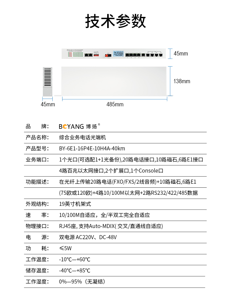 博扬 综合业务电话光端机 6路E1+16路电话+4路热线+4路百兆网+10路磁石 单纤40km 机架 白色