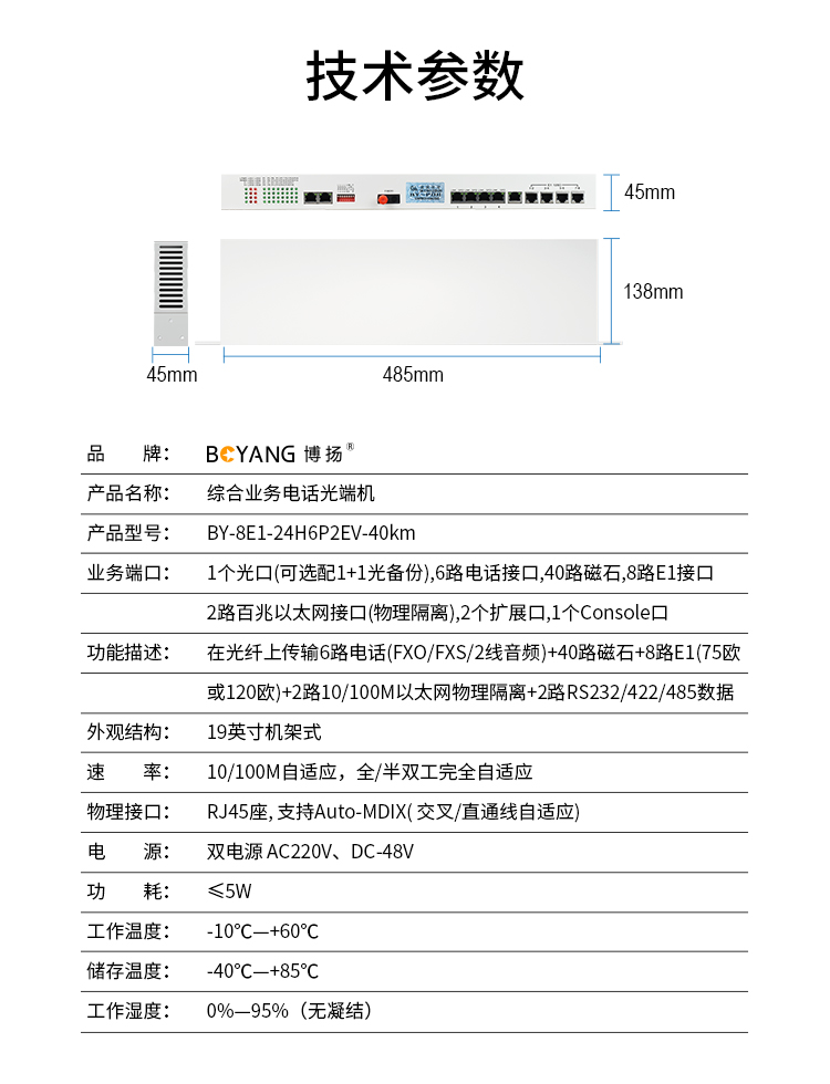博扬 综合业务光端机 8E1+6路电话+24路磁石+2路百兆物理隔离网 单纤40km 机架式1对价 白色