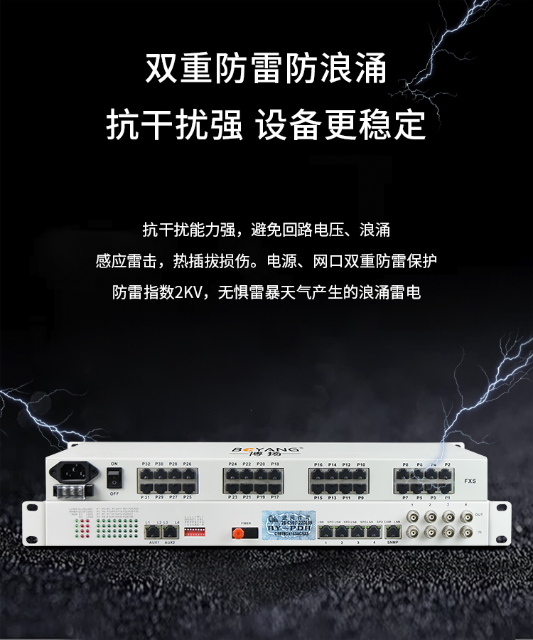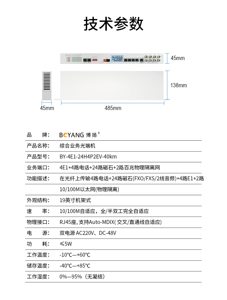 博扬 综合业务光端机 4E1+4路电话+24路磁石+2路百兆物理隔离网 单纤40km 机架式1对价 白色