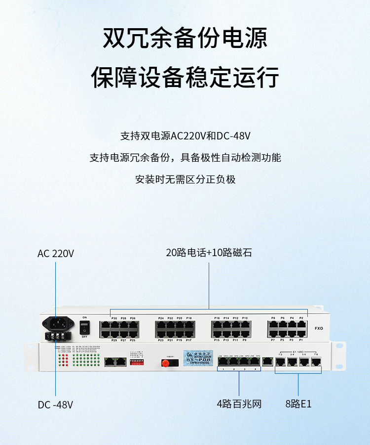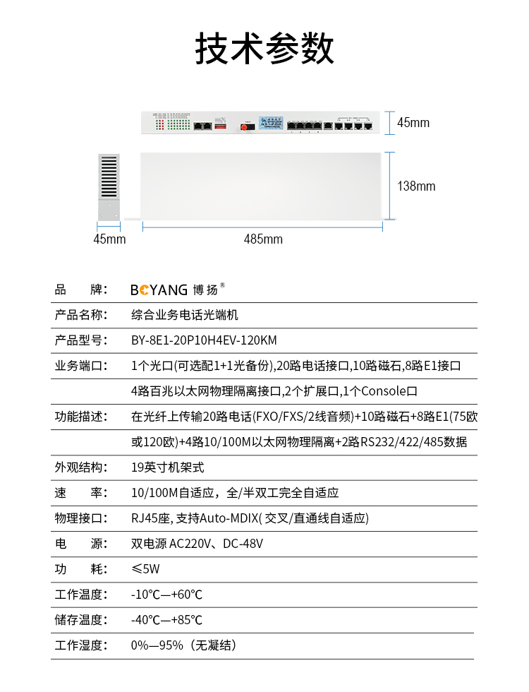 博扬 综合业务电话光端机 8E1+20路电话+10路磁石+4百兆隔离网 单纤FC 120km 1对 白色