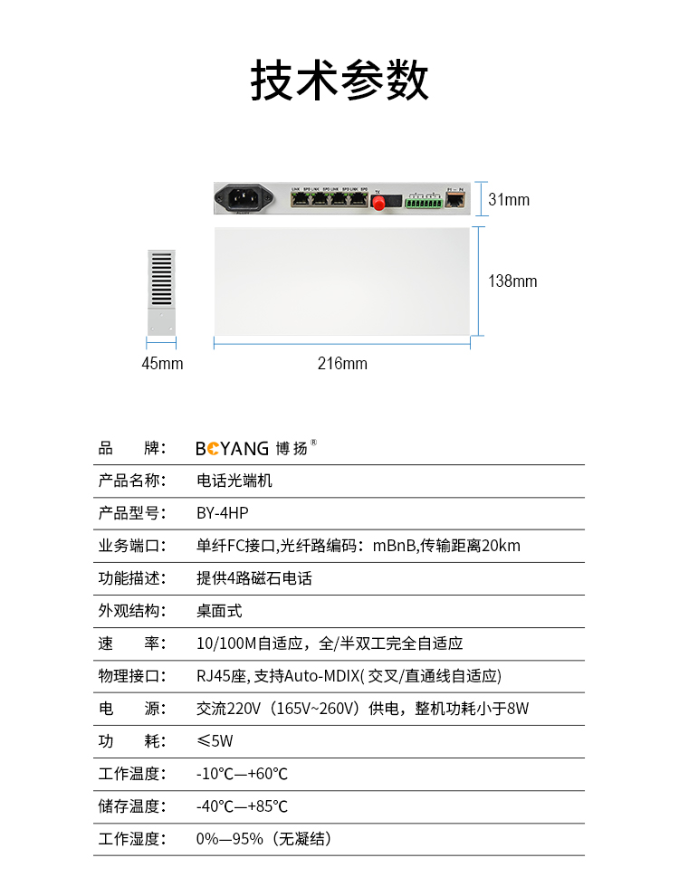 博扬 电话光端机 4路磁石电话光端机 单模单纤20KM 1对价 BY-4HP 白色