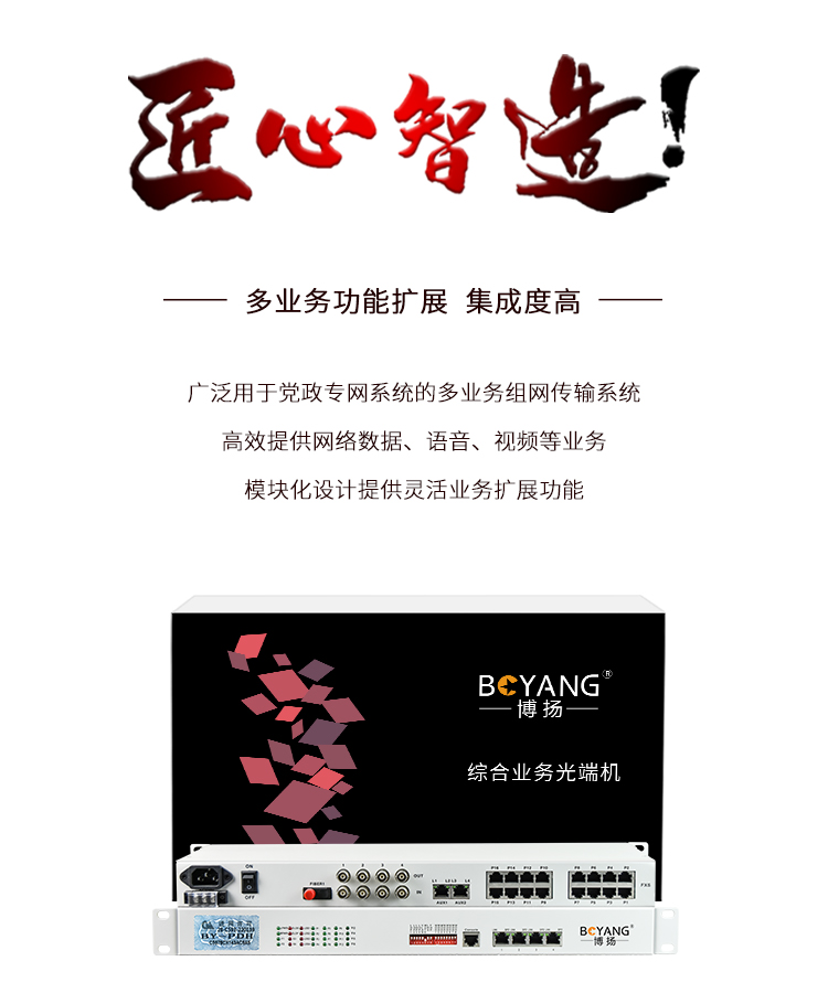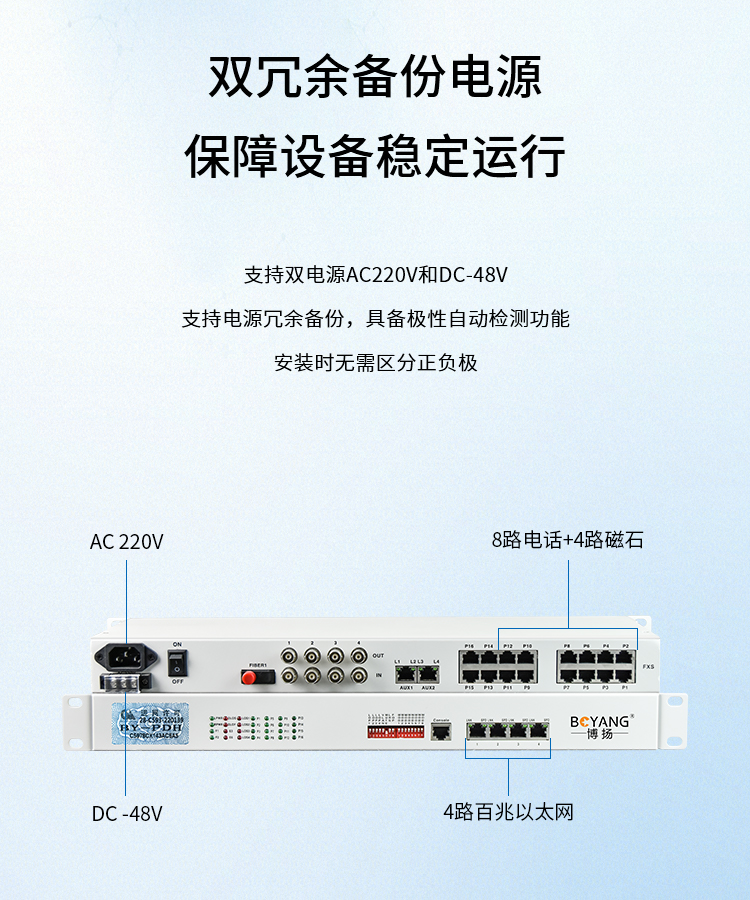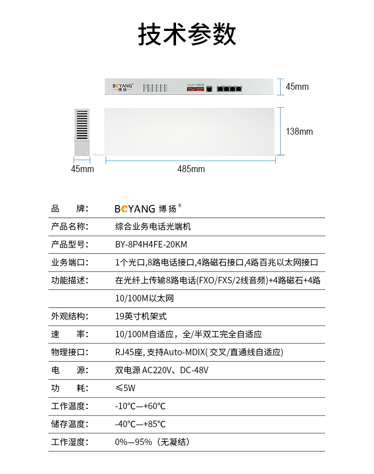 博扬 综合业务电话光端机 8路电话+4路百兆网络+4路磁石 单纤20km 机架式 1对价 BY-8P 白色
