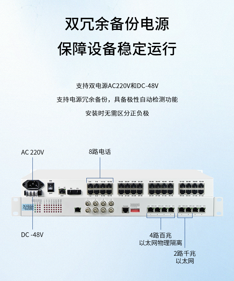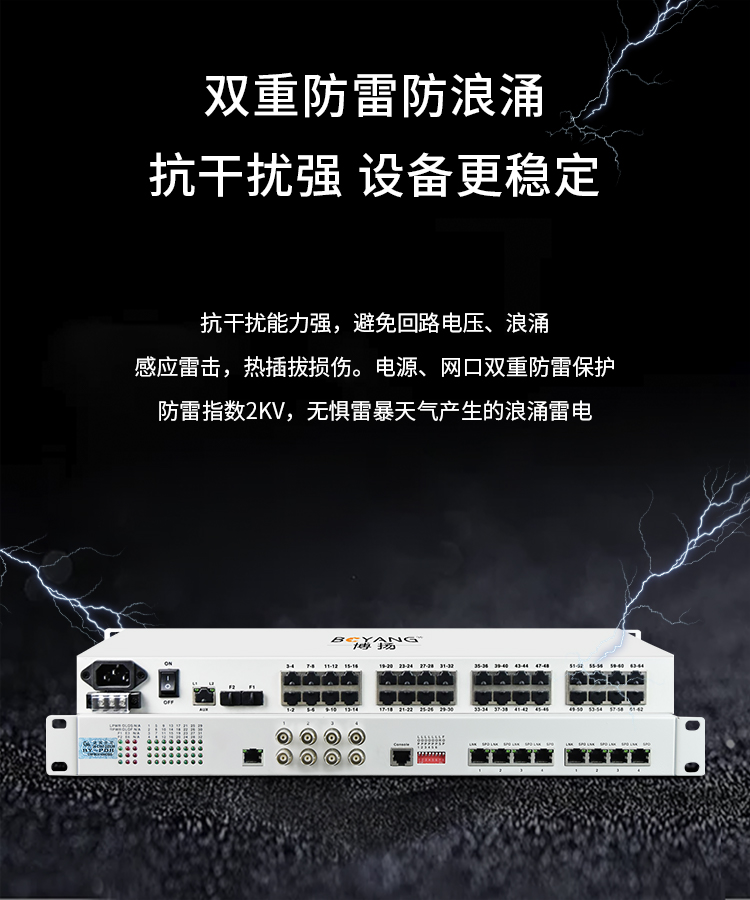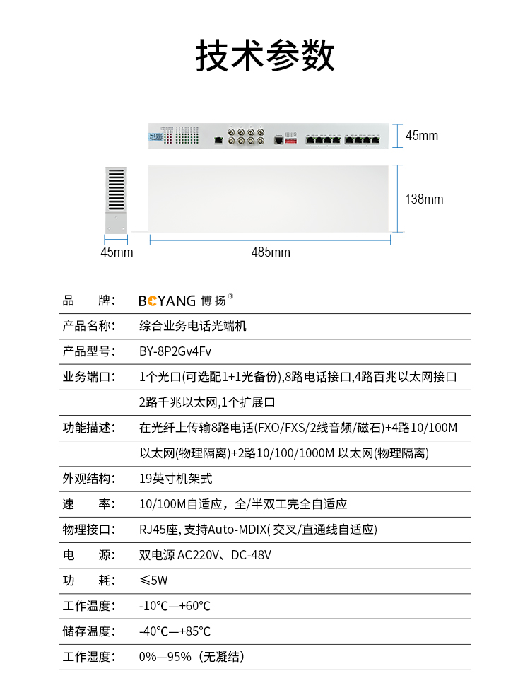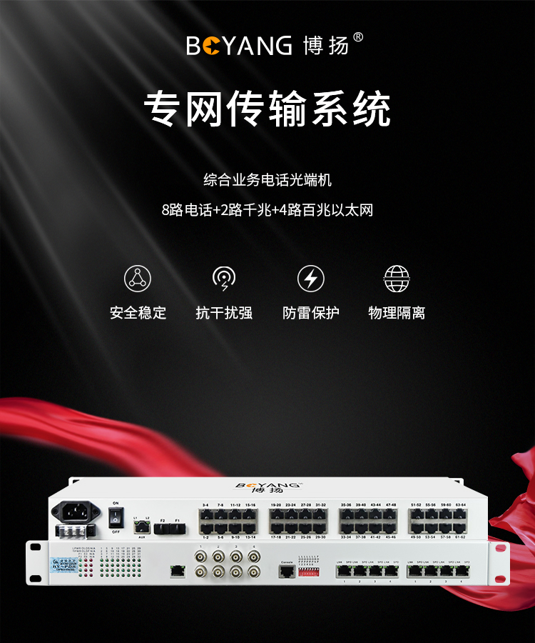 博扬 综合业务电话光端机 8路电话+2路千兆+4路百兆以太网物理隔离 LC单纤60km 机架式 1对 白色