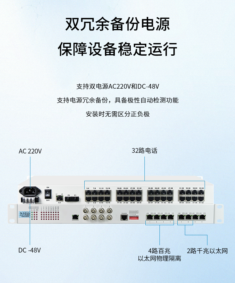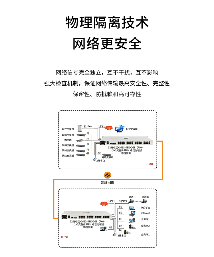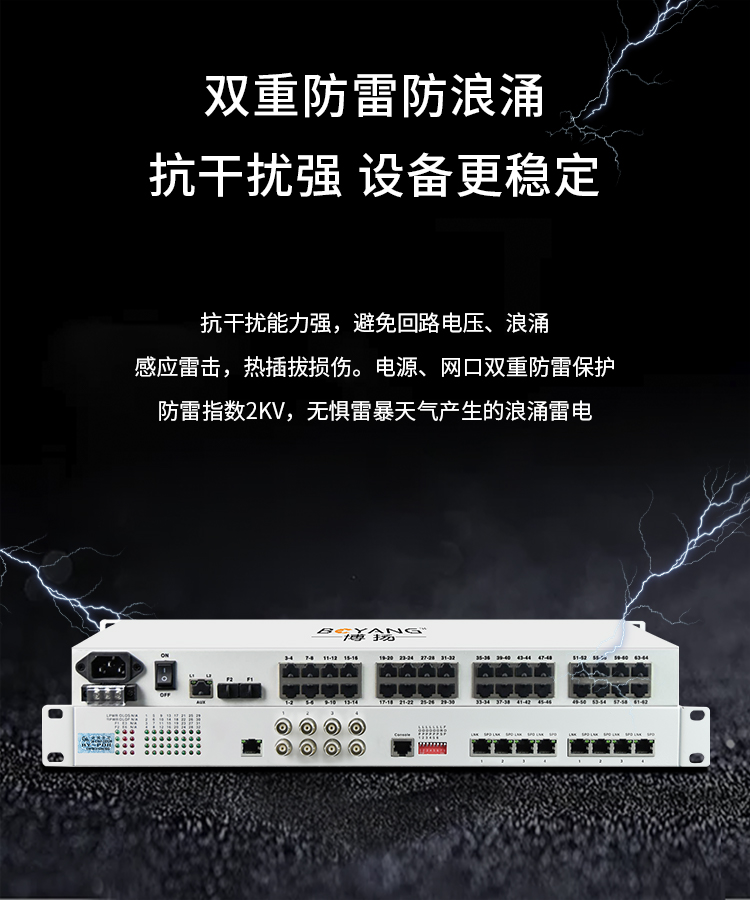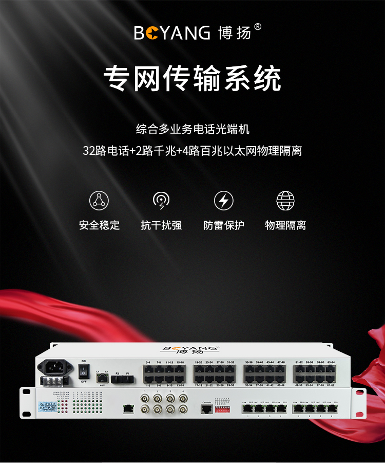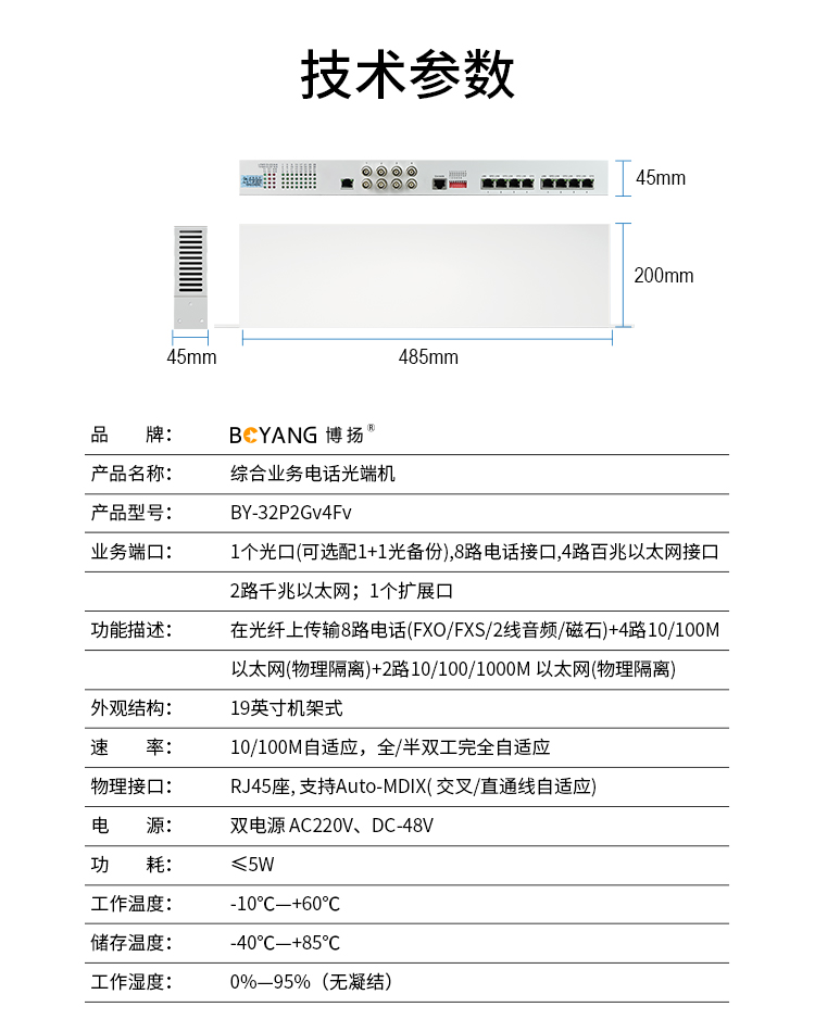 博扬 综合业务电话光端机 32路电话+2路千兆+4路百兆以太网物理隔离 LC单纤60km 机架式1对 白色