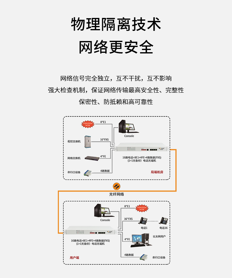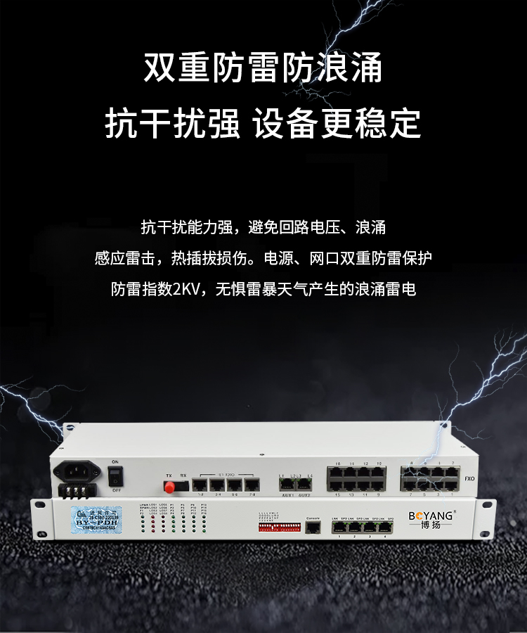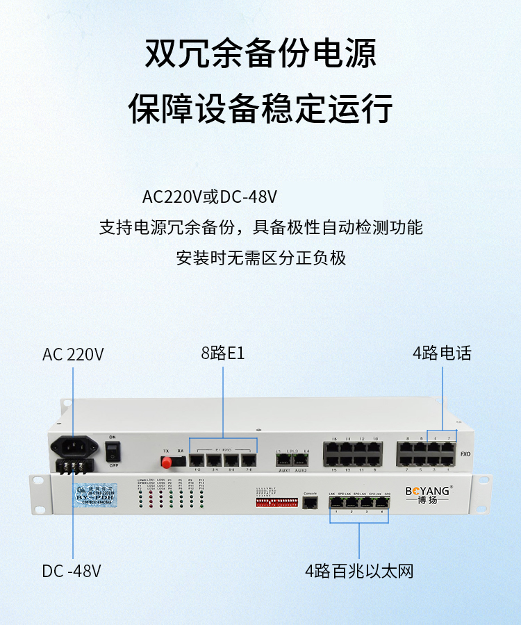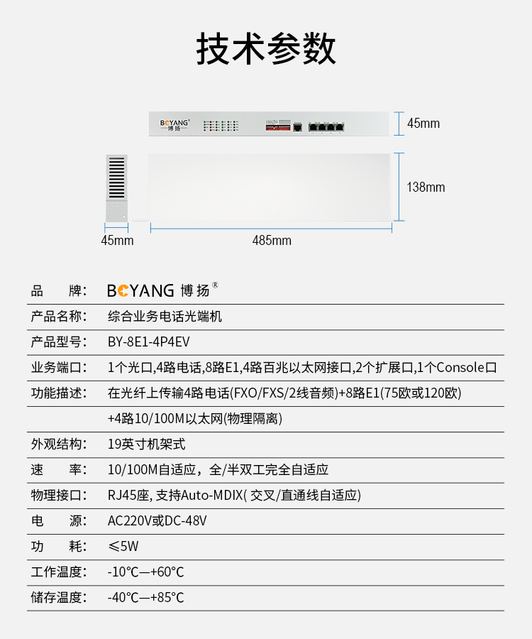 博扬 综合业务电话光端机 8路E1+4电话+4路百兆以太网物理隔离网 单纤20km 机架式 单电源 白色