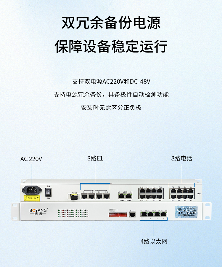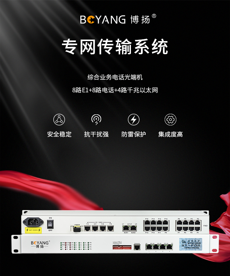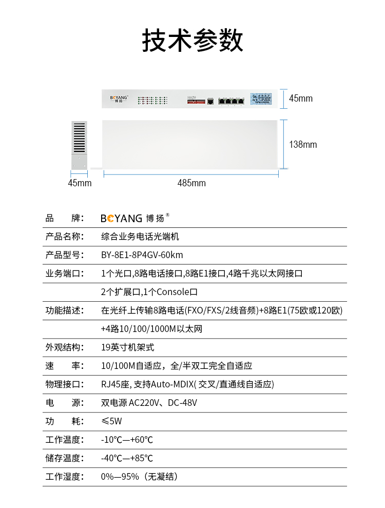博扬 综合业务电话光端机 8路E1+8路电话+4路千兆以太网隔离 单纤60km 机架式 1对价 白色