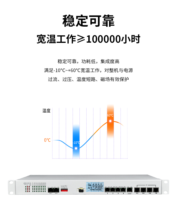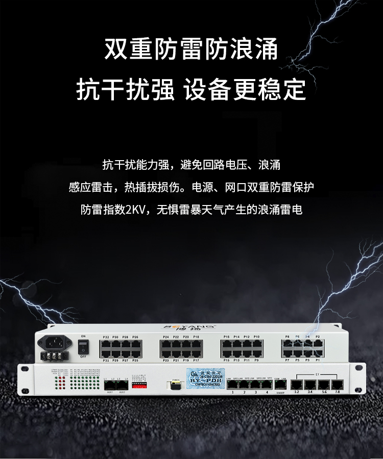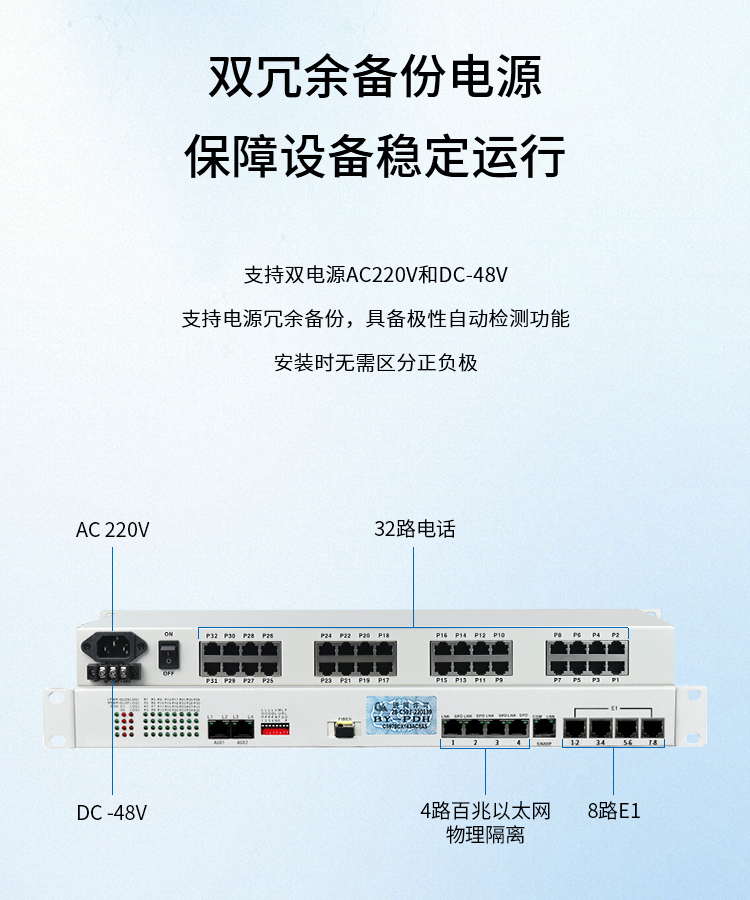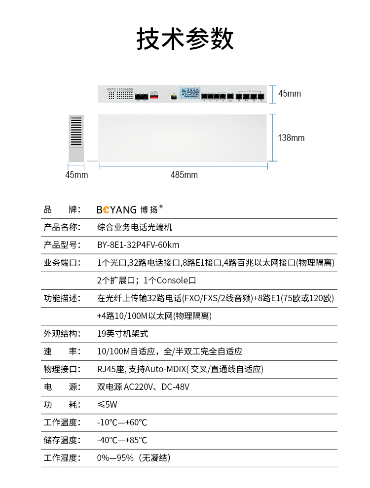 博扬 综合业务电话光端机 8路E1+32路电话+4路百兆以太网物理隔离 单纤60km 机架式 1对价 白色