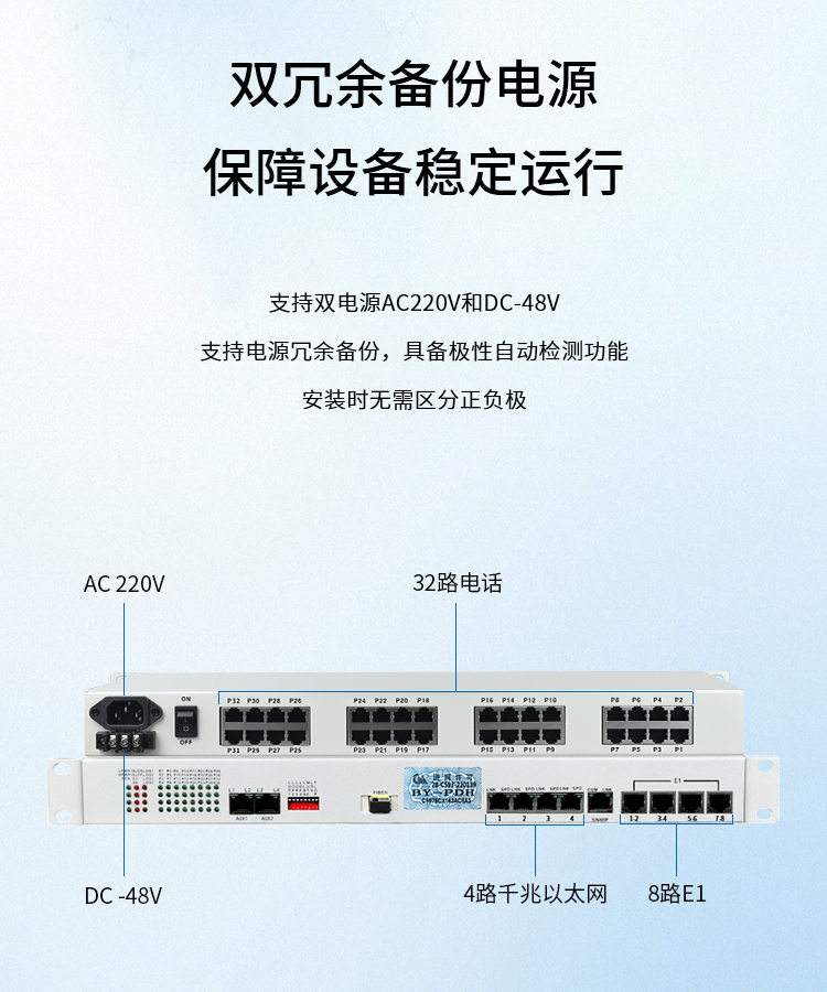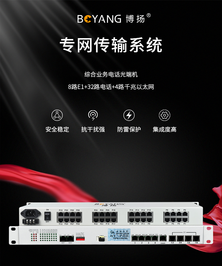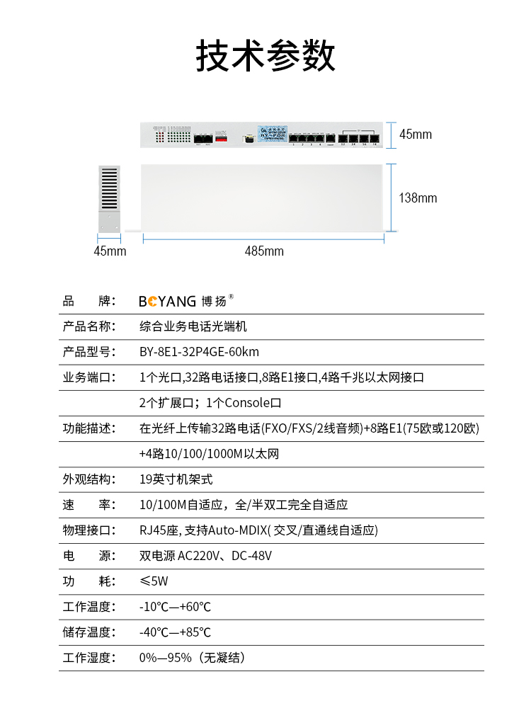 博扬 综合业务电话光端机 8路E1+32路电话+4路千兆共享以太网 单纤60km 机架式 1对价 白色
