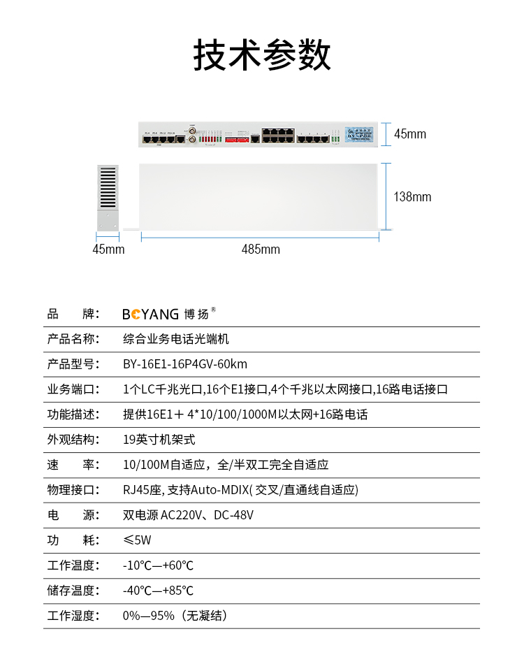 博扬 综合业务电话光端机 16路E1+16路电话+4路千兆以太网隔离 单纤60km 机架式 1对价 白色
