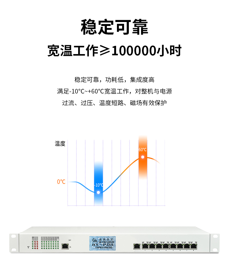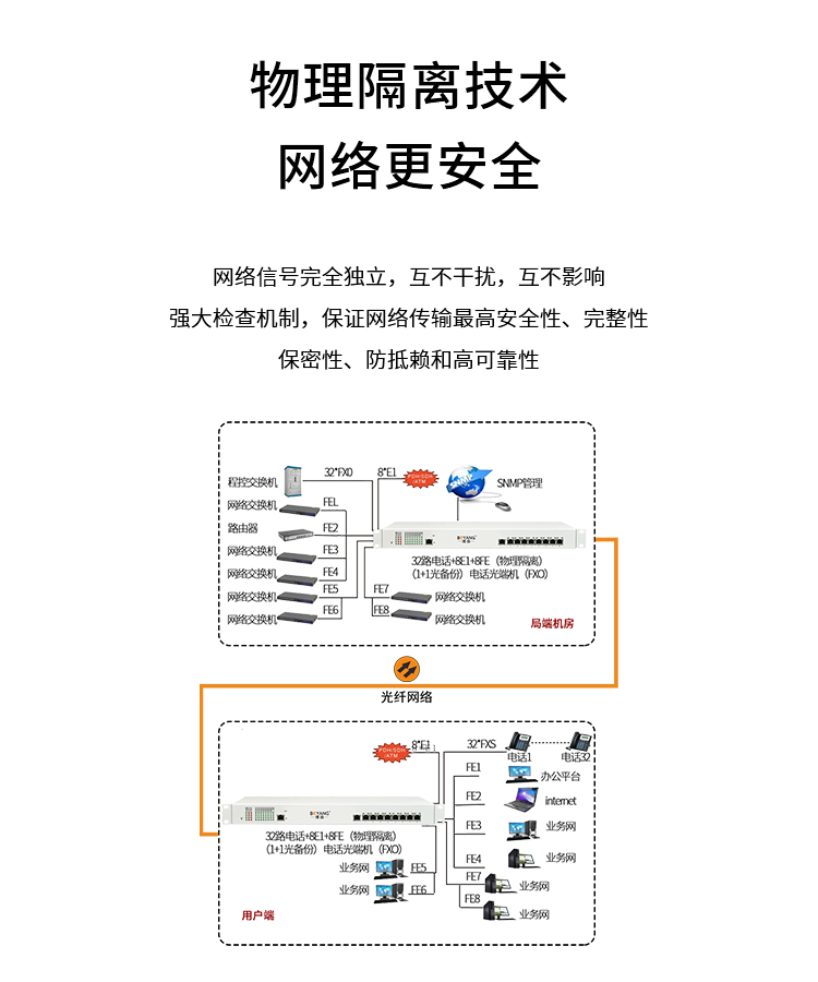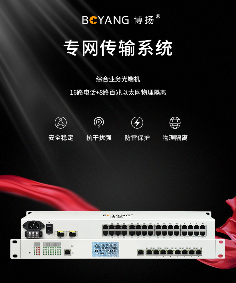 博扬 综合业务光端机 16路电话+8路百兆以太网物理隔离 单纤20km 机架式 白色