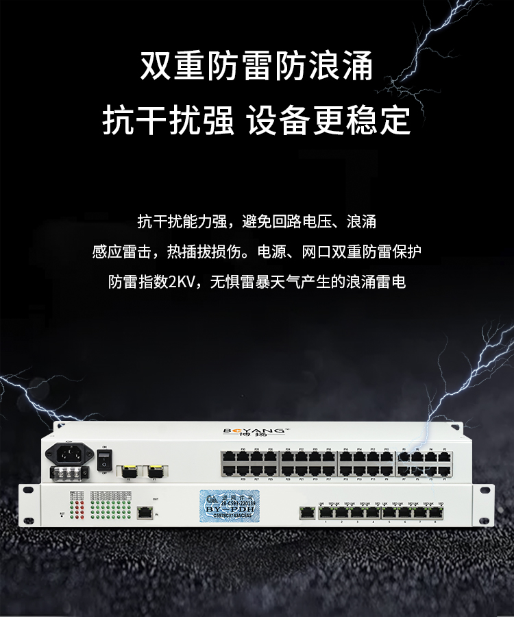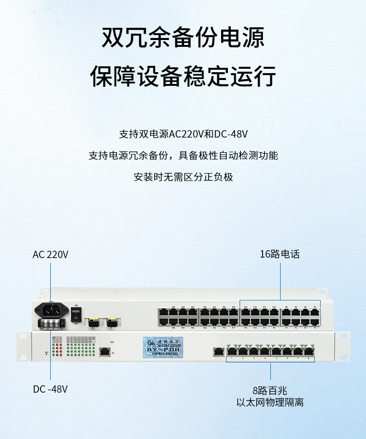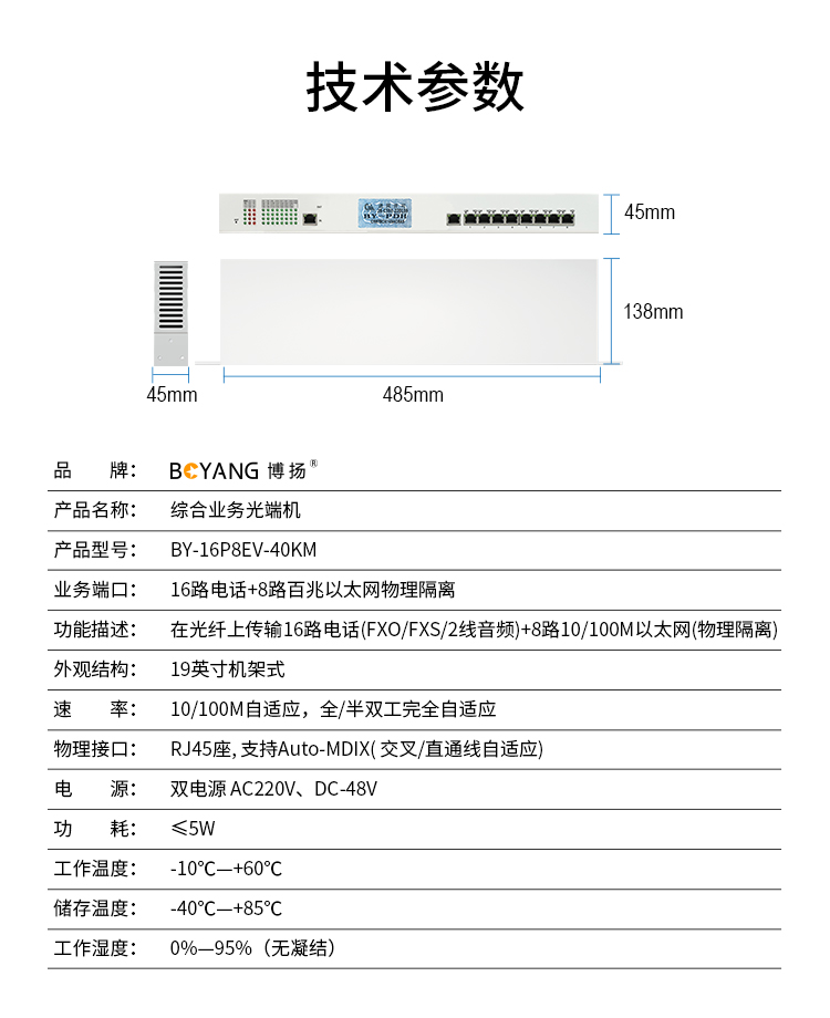 博扬 综合业务光端机 16路电话+8路百兆以太网物理隔离 单纤40km 机架式 BY-16P8EV- 白色