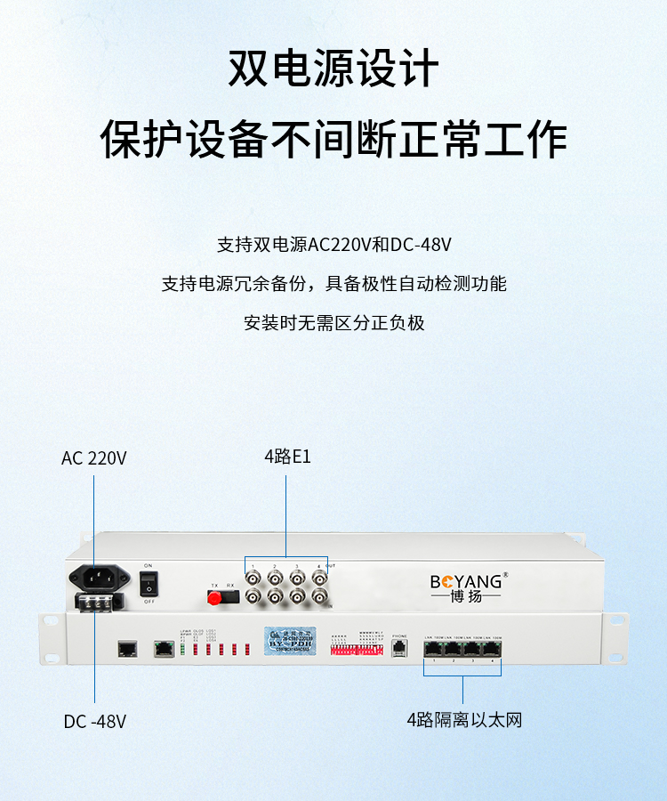 博扬 PDH光端机4E1 4路2M+4路以太网带物理隔离 FC单纤120公里 机架式1对价 白色