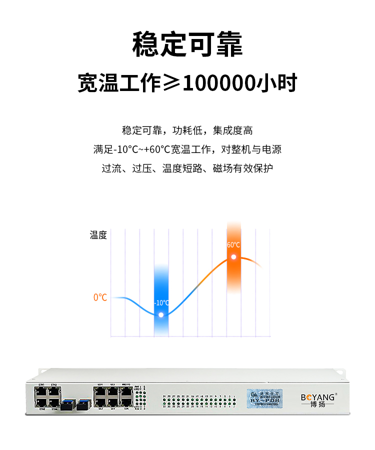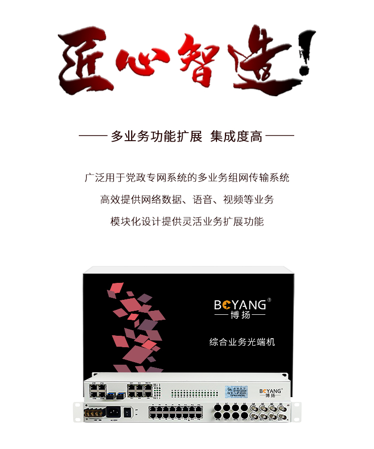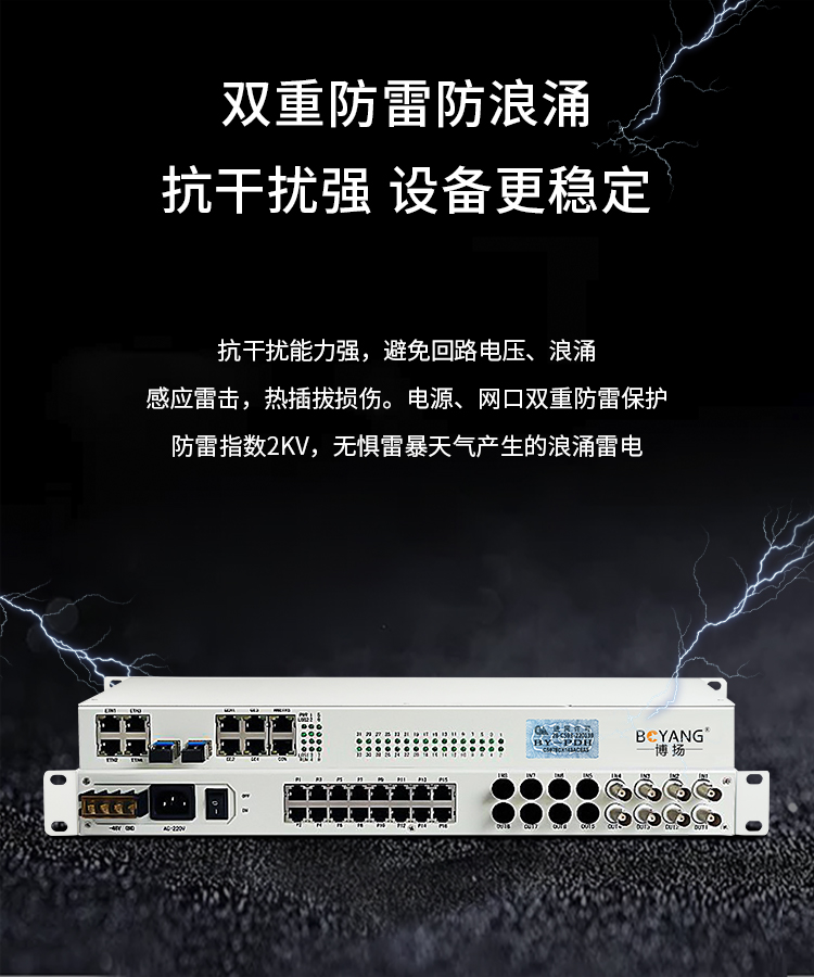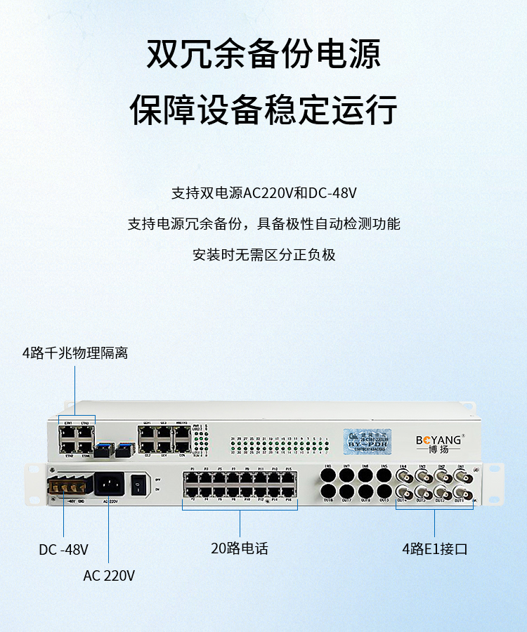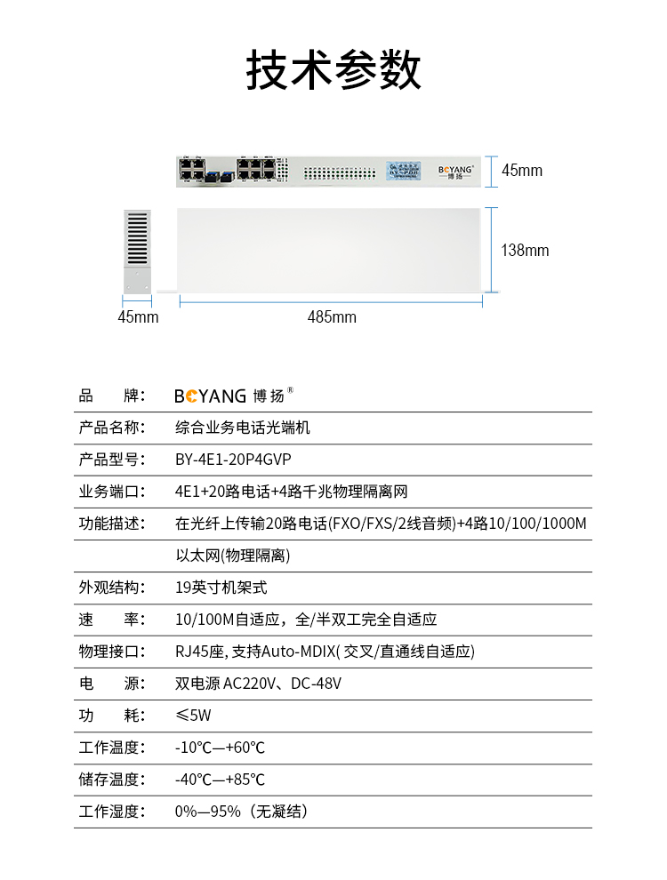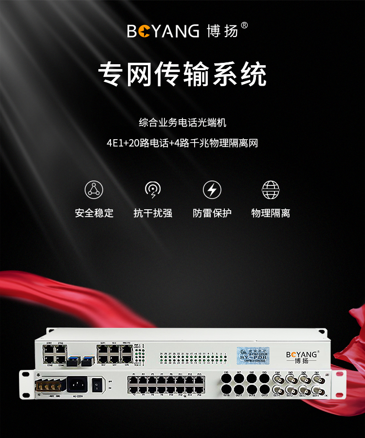 博扬 综合业务电话光端机 4E1+20路电话+4路千兆以太网物理隔离 10G光口LC单纤40km机架 白色