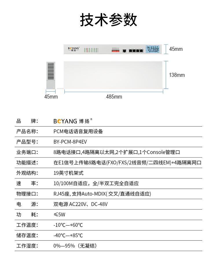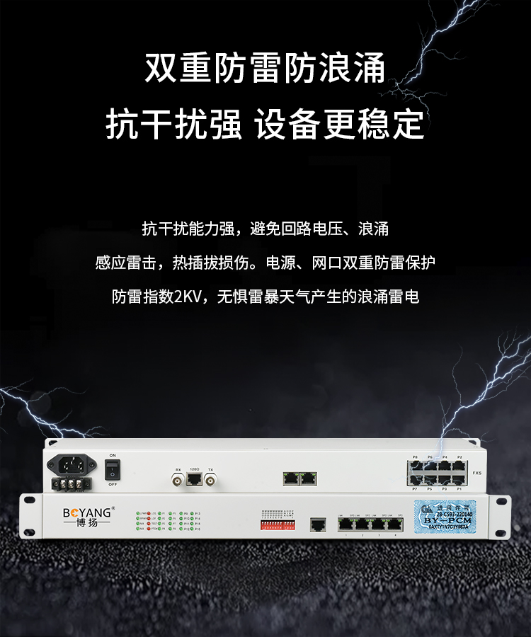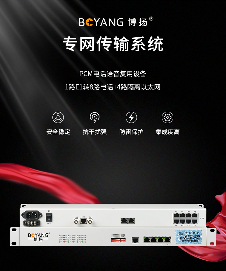 博扬 PCM电话语音复用设备光端机 1路E1转8路电话+4路隔离以太网 机架式单电源 1对价 白色