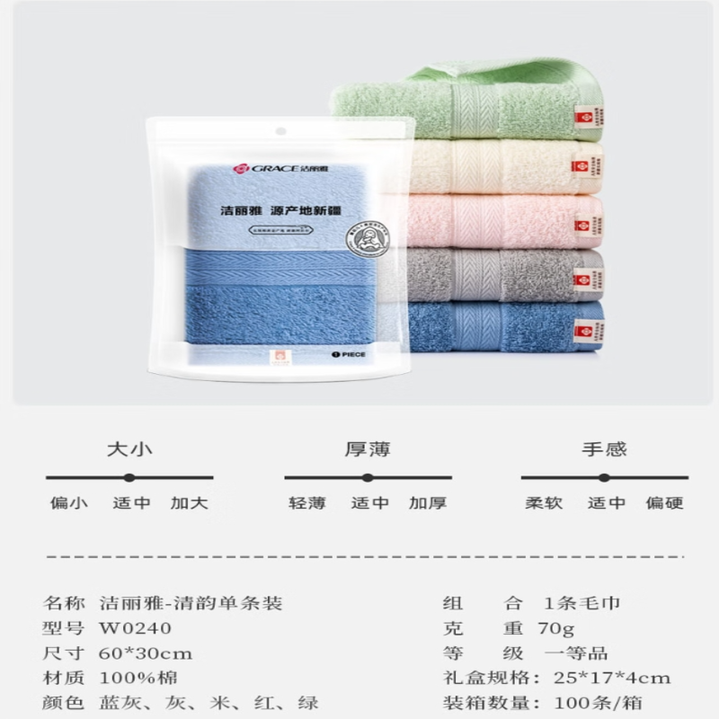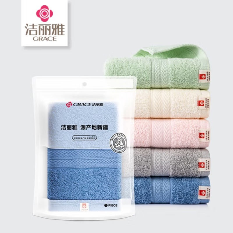 洁丽雅(Grace) 清韵纯棉毛巾单条装 W0240 60*30cm 混色(单位:条)