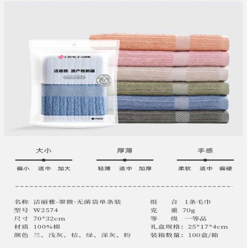 洁丽雅(Grace) 翠微纯棉毛巾单条装 W2574 70*32cm 混色(单位:条)