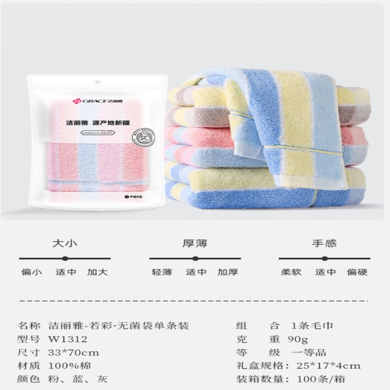 洁丽雅(Grace) 若彩纯棉毛巾单条装 W1312 33*70cm 混色(单位:条)