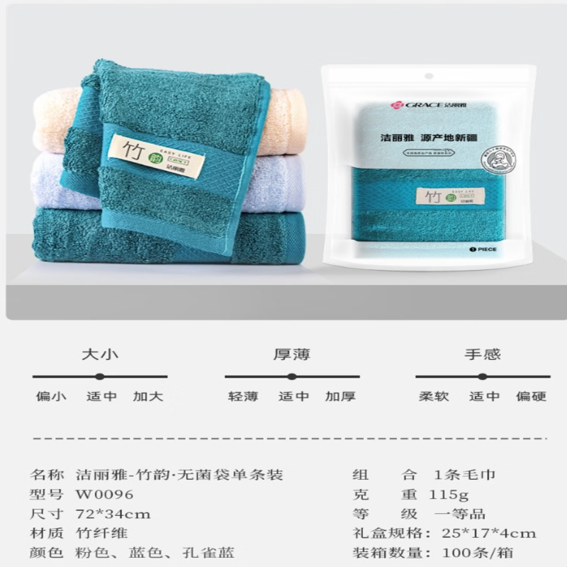 洁丽雅(Grace) 竹韵纯棉毛巾单条装 W0096 72*34cm 混色(单位:条)