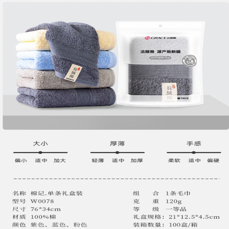 洁丽雅(Grace) 棉记纯棉毛巾单条装 W0078 76*34cm 混色(单位:条)