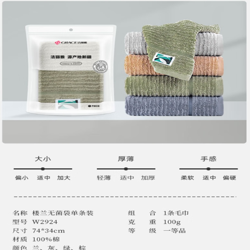 洁丽雅(Grace) 楼兰纯棉毛巾单条装 W2924 74*34cm 混色(单位:条)