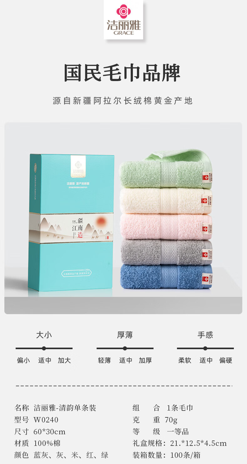 洁丽雅(Grace) 清韵毛巾单条礼盒装 W0240 60*30cm 混色(单位:盒)