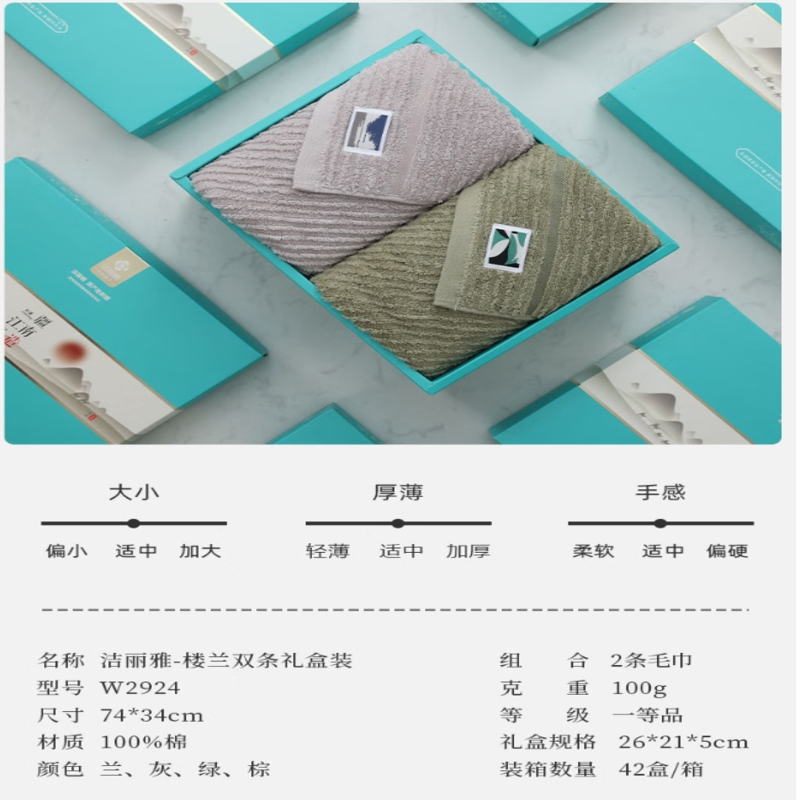 洁丽雅(Grace) 楼兰毛巾双条礼盒装 W2924 74*34cm*2条 混色(单位:盒)
