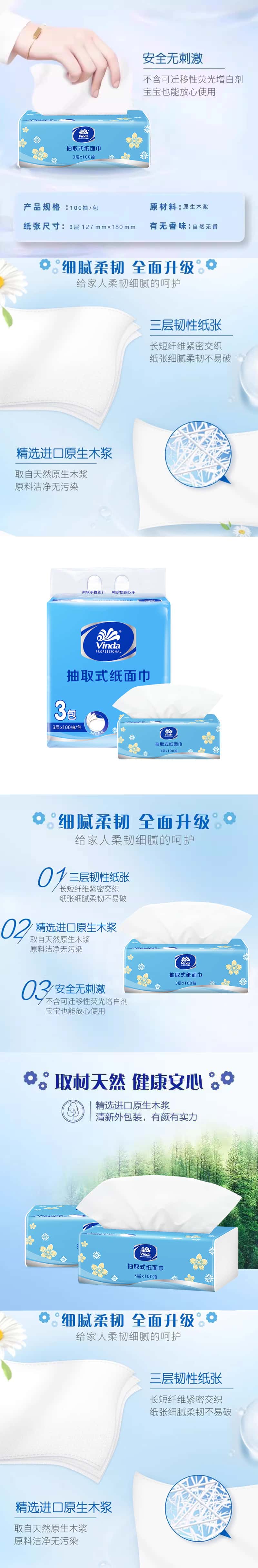 维达 细韧小雏菊抽纸 VSD2017-3B 3层100抽3包 水蓝色(单位:提)