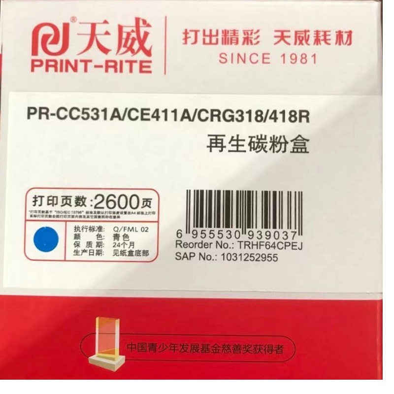 天威(PrintRite) PR-CC531A/CE411A/418R 专业装 适用HP M375nw 硒鼓 1.00 只/支 (计价单位:支) 青色