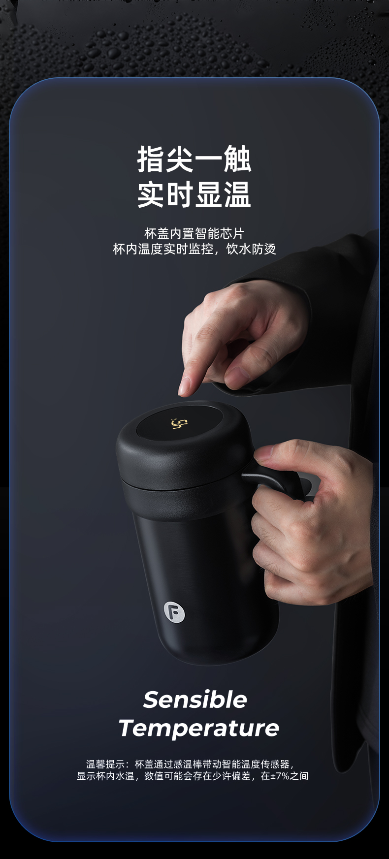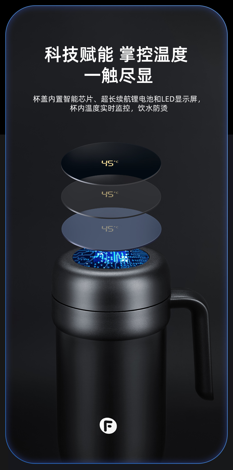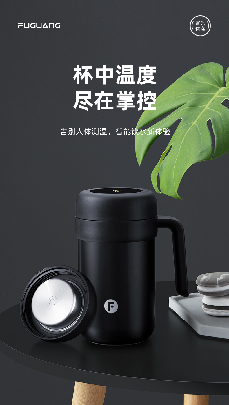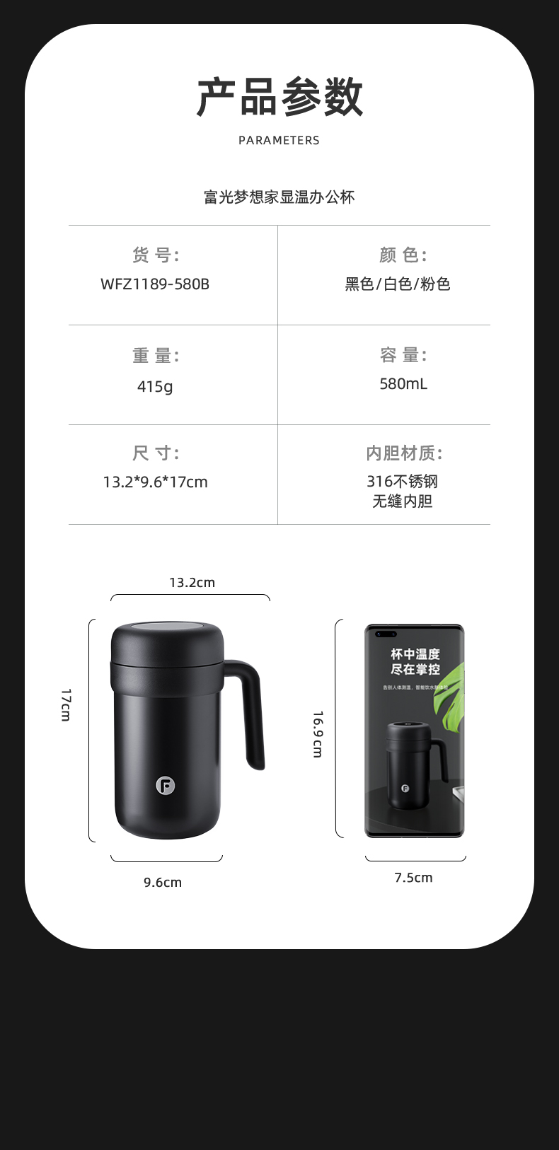 富光 梦想家系列保温杯 316不锈钢智能显温水杯580ML WFZ1189-580B 黑色