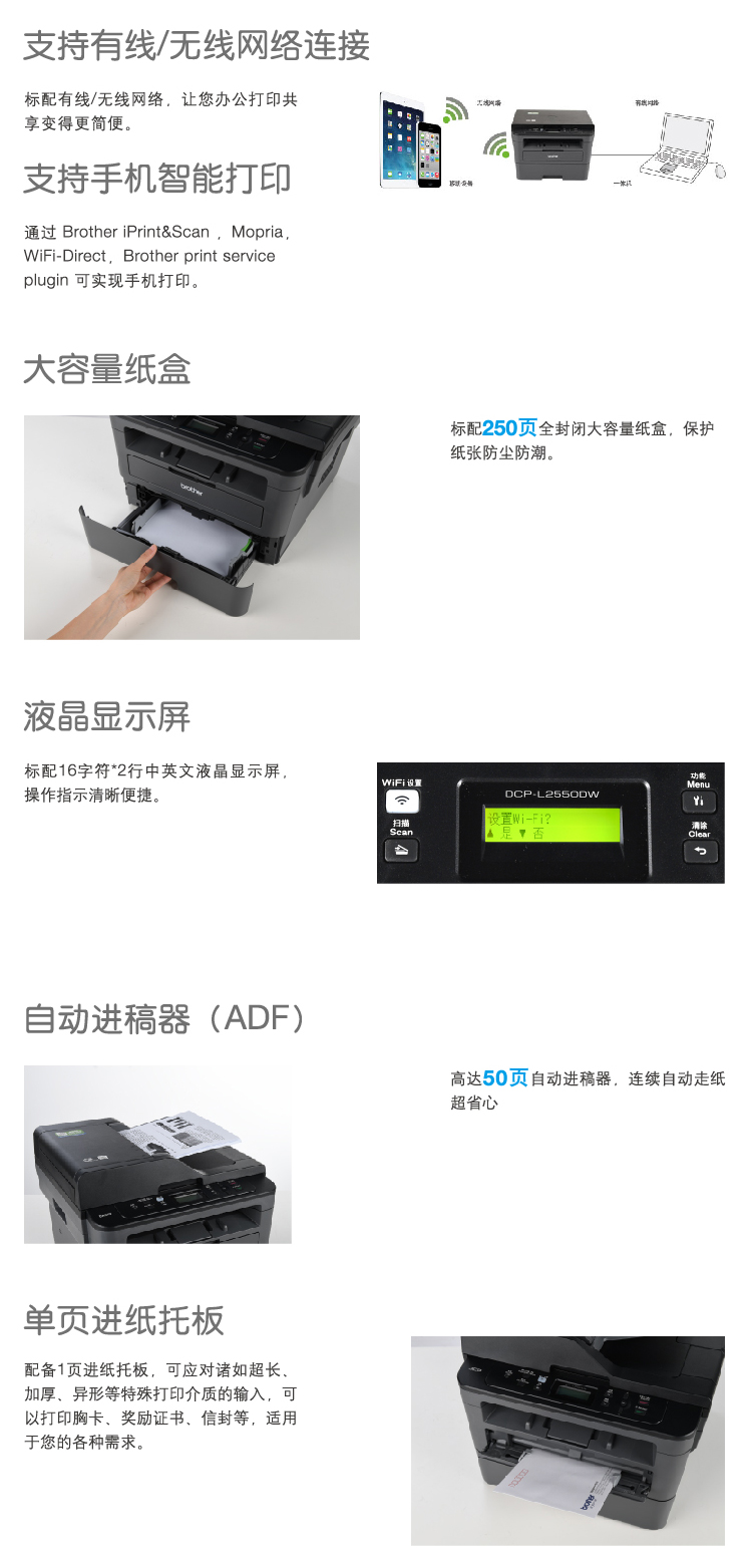 兄弟(brother) 黑白激光一体机(三合一 双面打印 有线&无线连接)DCP-L2550DW 黑色