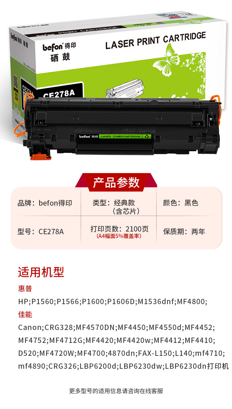 得印CE278A 78A硒鼓 适用惠普M1536dnf粉盒P1606dn P1566 P1560 佳能CRG-326 328 MF4712 MF4452 MF4400墨盒 黑色