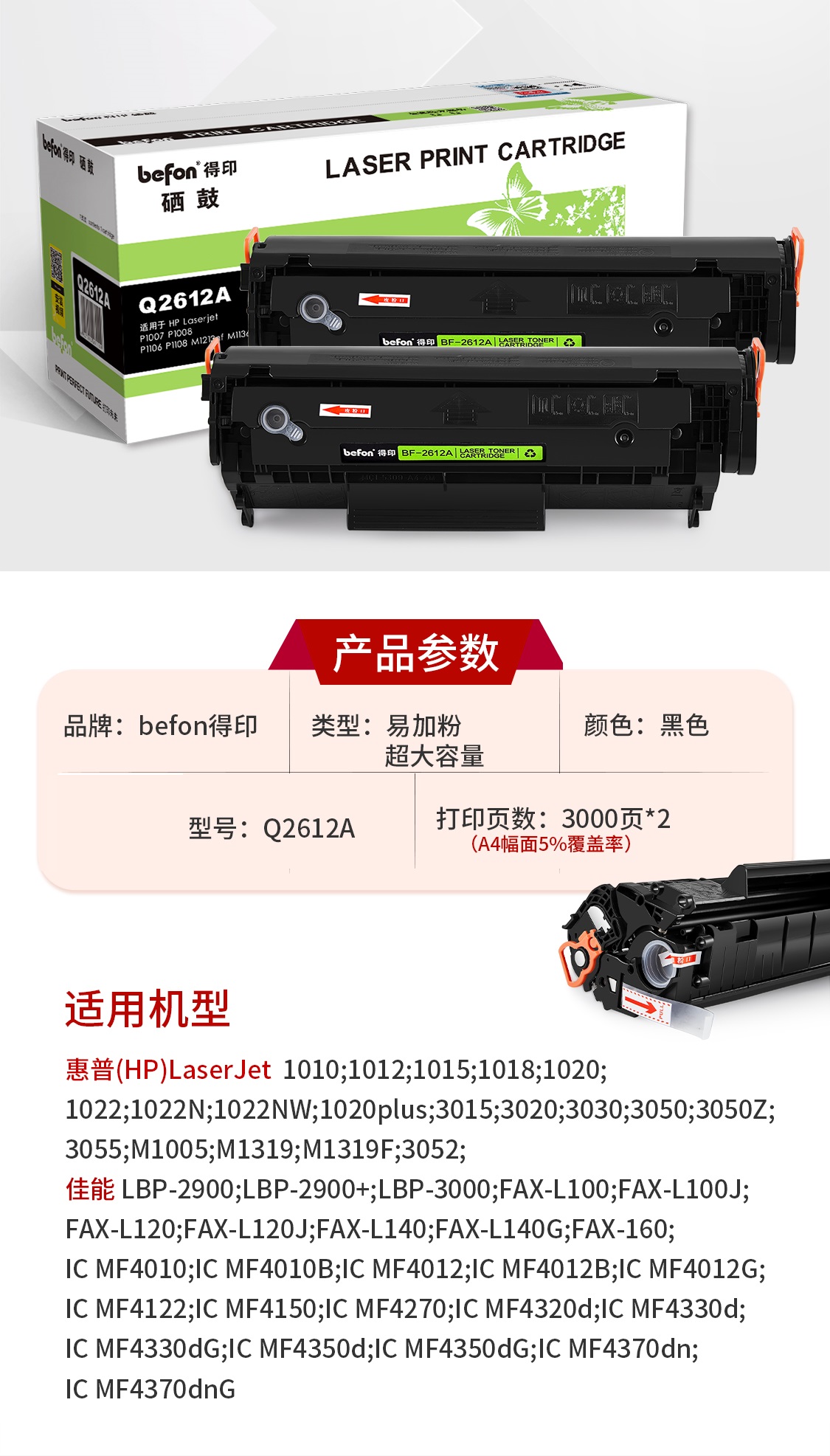 得印 Q2612A 超大容硒鼓2支装 惠普1020 m1005 1020plus 1010 单位:支 黑色