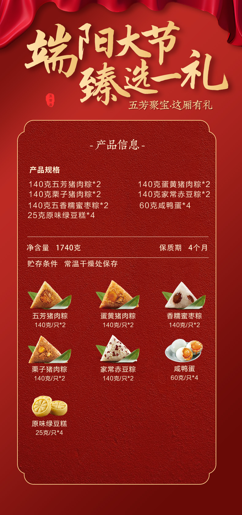 五芳斋 粽子 1740g 五芳聚宝礼盒 红色(单位:盒)
