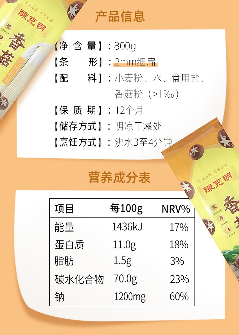 陈克明面条 香菇+玉米+荞麦风味挂面 800g*3包/4.8斤(新疆,西藏不发货) 黄色