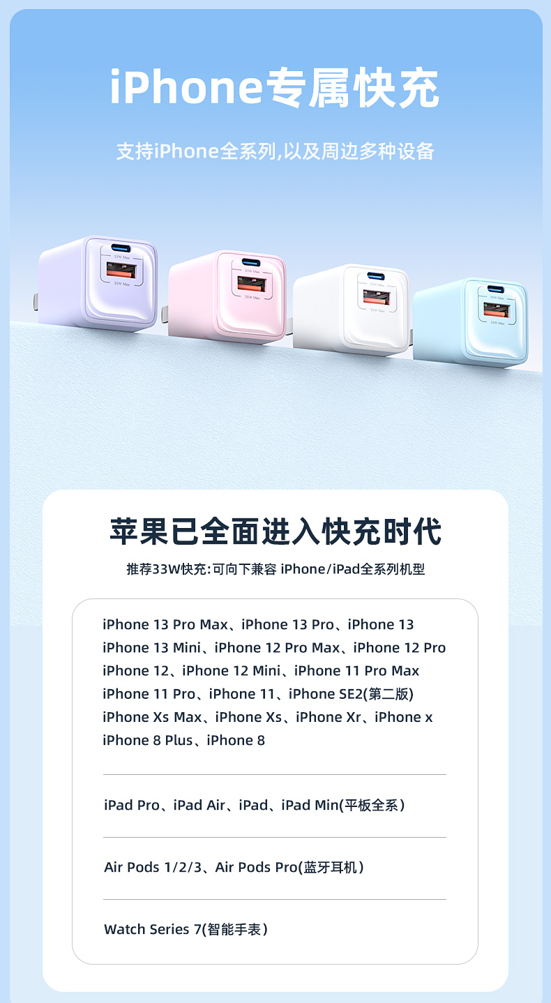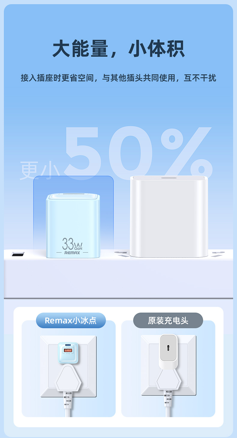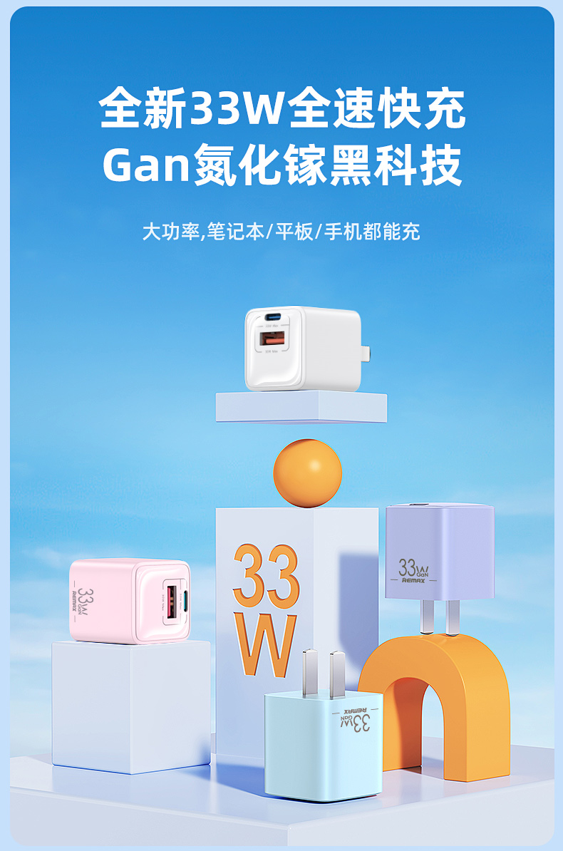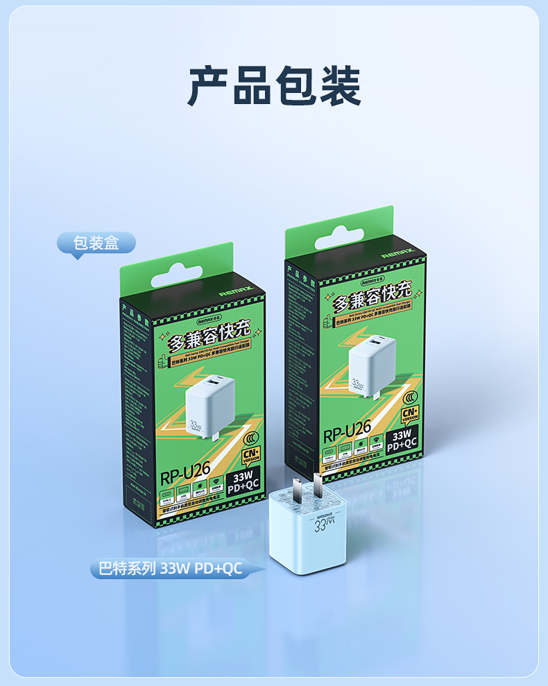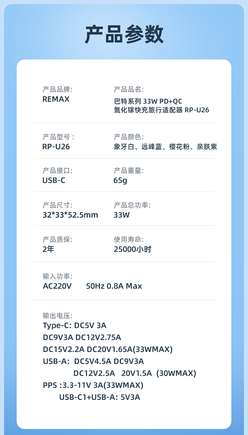 REMAX睿量 巴特系列 33W PD+QC 多兼容快充旅行适配器 RP-U26 中规鸢尾紫/冰透蓝/冰雾粉/白色 粉色