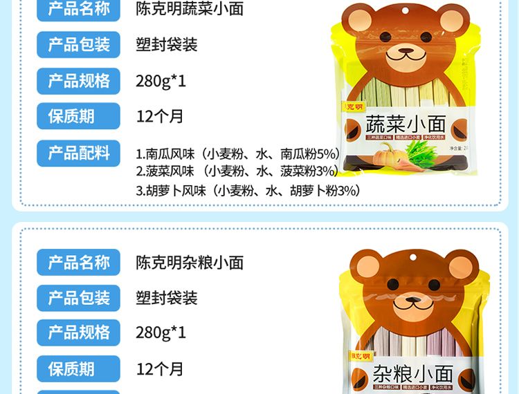 陈克明 儿童高钙挂面 280g*5包 宝宝儿童营养面条 蓝色