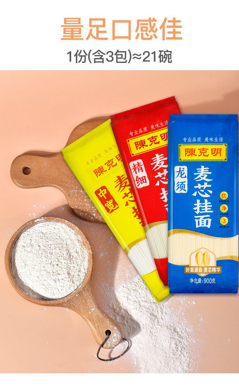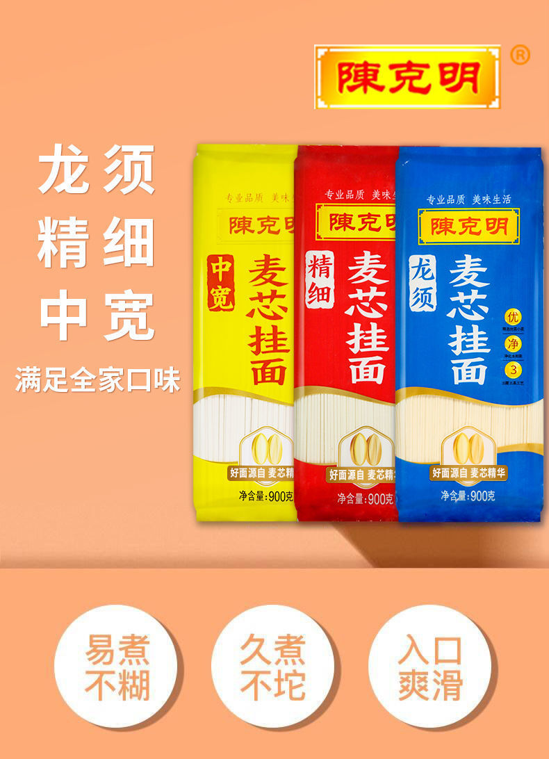 陈克明面条 龙须+精细+中宽麦芯挂面 900g*3包/5.4斤 三种条形 红色