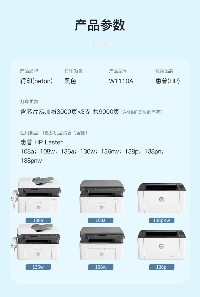 得印 W1110A 110A硒鼓大容量易加粉3支装 适用惠普HP 136w墨盒粉盒带芯片 【大容量】含芯片-3支-9000页