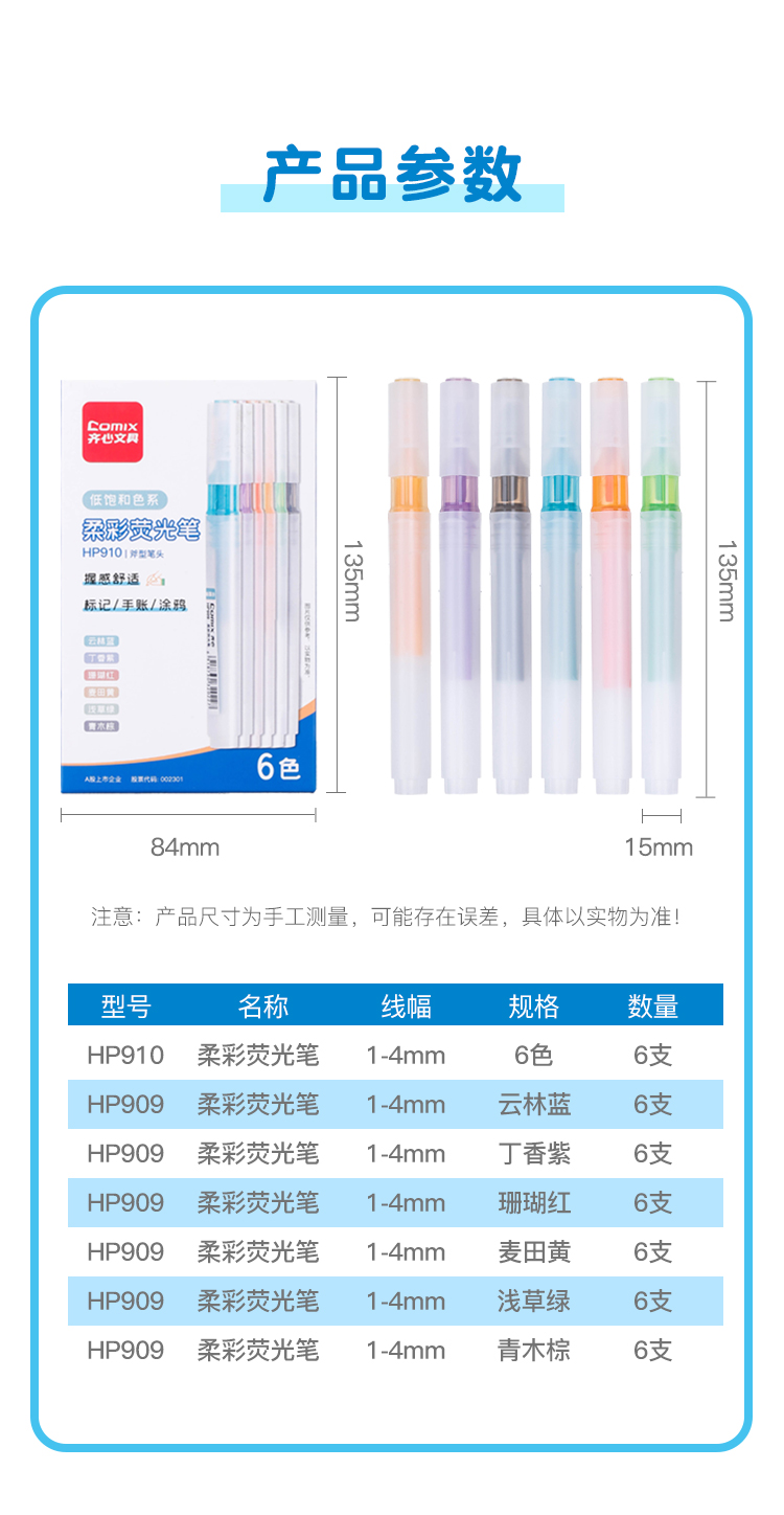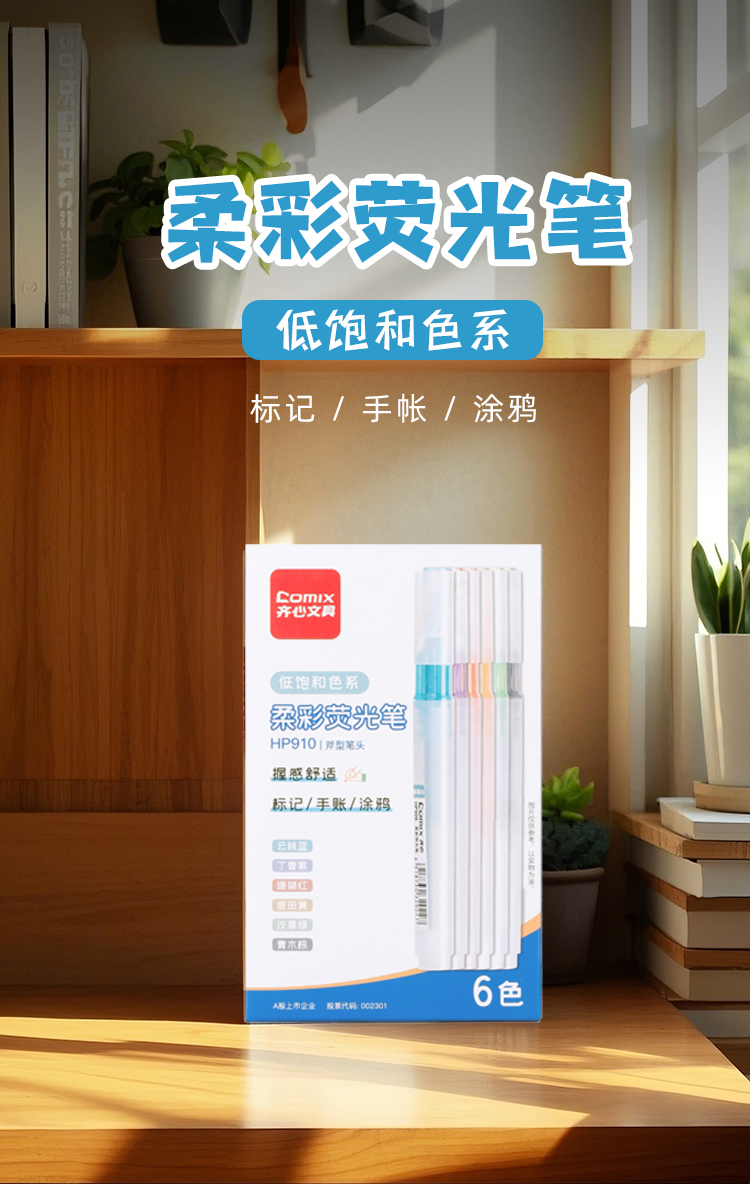 齐心(COMIX) 柔彩荧光笔 HP909 6支/盒 黄色(单位:盒)