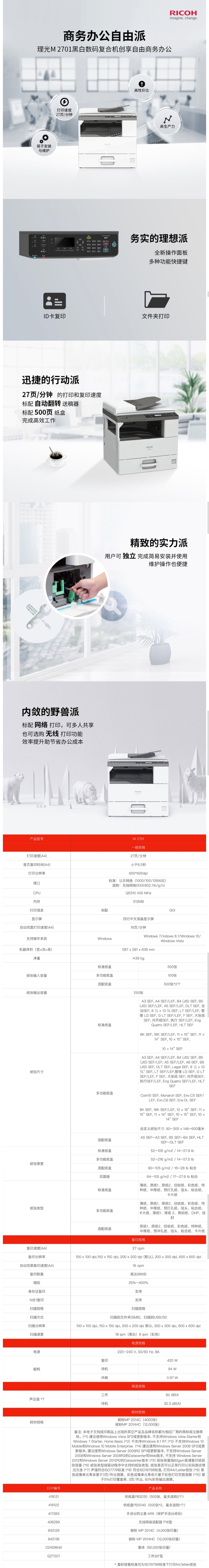 理光(RICOH) M2701 (双面器/双面自动输稿器/有线/无线网络打印/1100页) 复印机(仅限北京区域购买) 白色