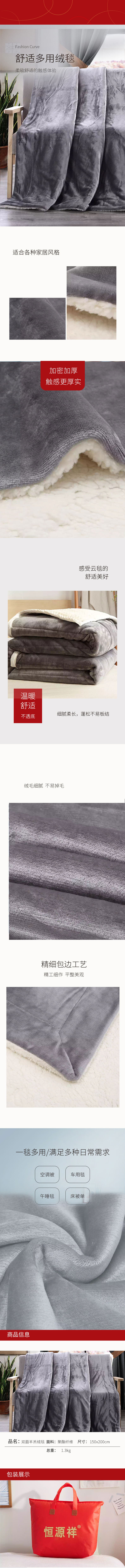 恒源祥HYGT01双面羊羔绒毯 灰色