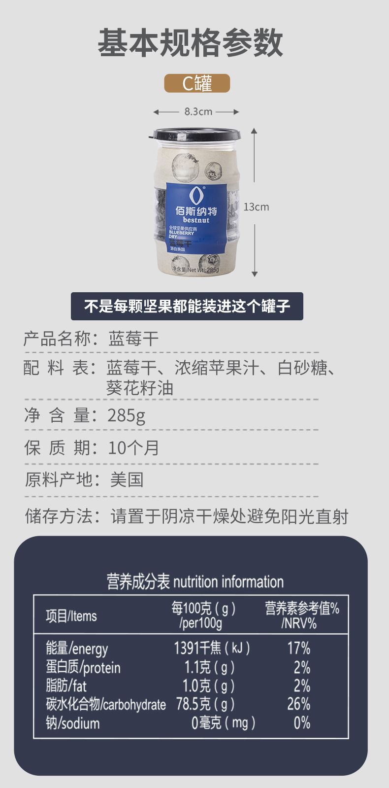 佰斯纳特蓝莓干285g/罐 宝石蓝