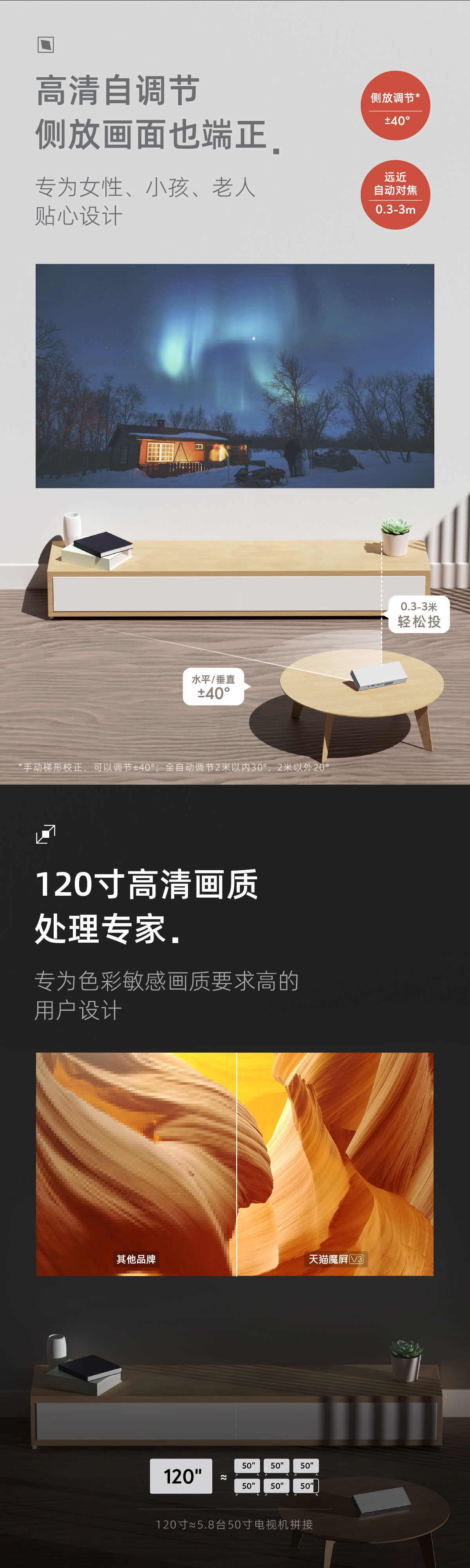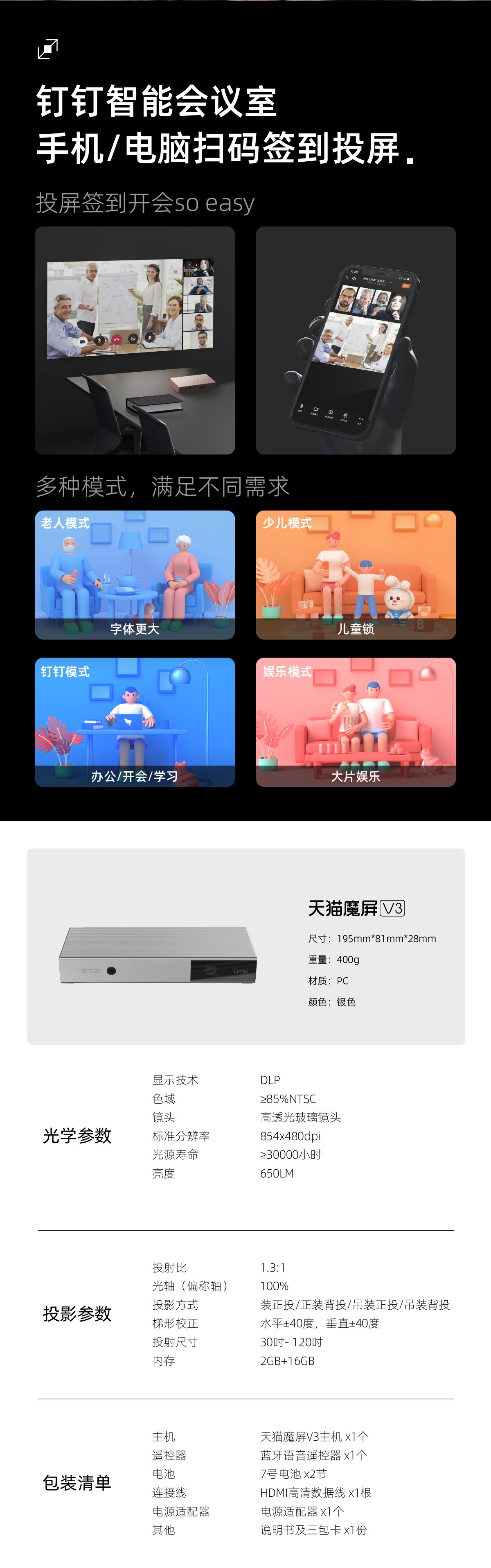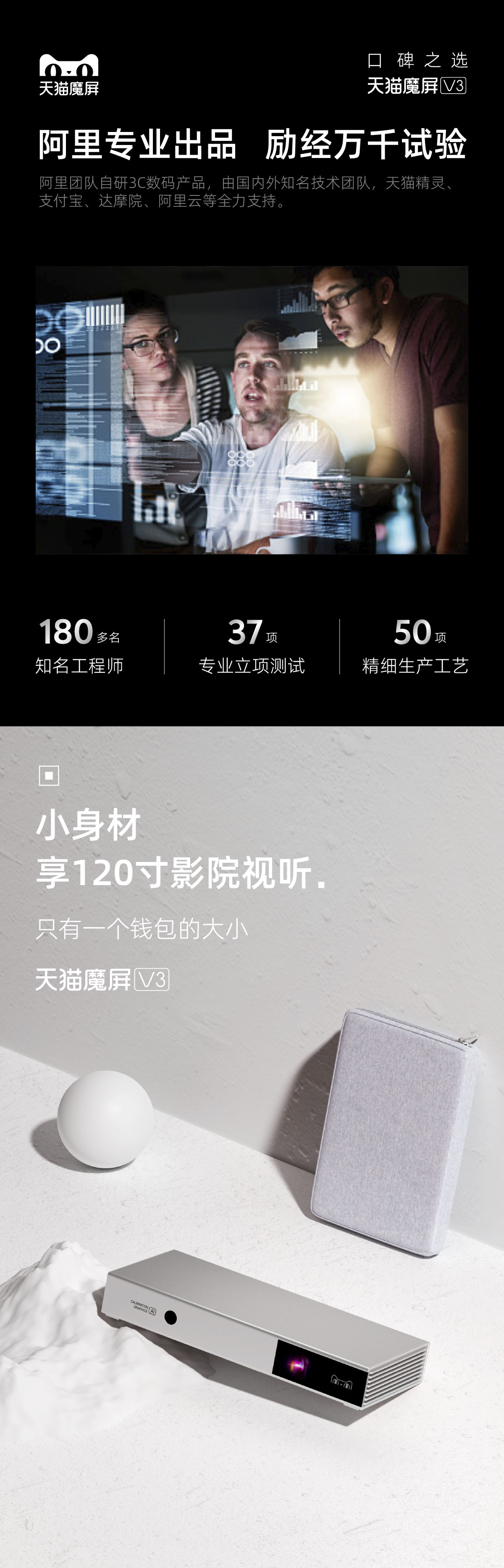 天猫魔屏V3投影仪家用投墙卧室客厅智能语音高清高亮手机投影电视3D大屏智能家庭影院 银色